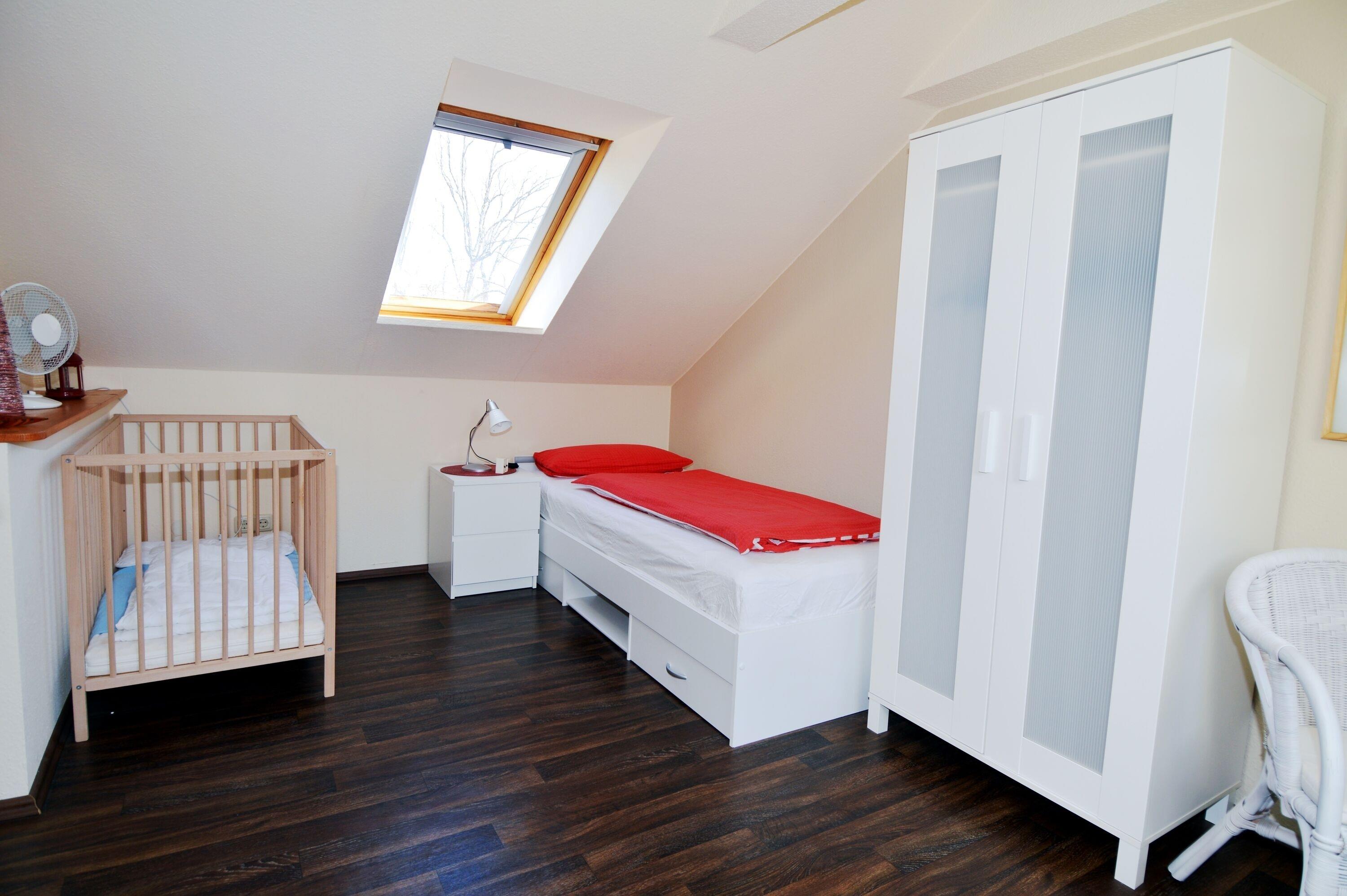 Im Dachgeschoss steht ein weiteres Schlafzimmer zur Verfügung, ausgestattet mit Einzelbett, Gitterbett und TV. Damit ist die Wohnung besonders gut für Gäste mit Kind geeignet.