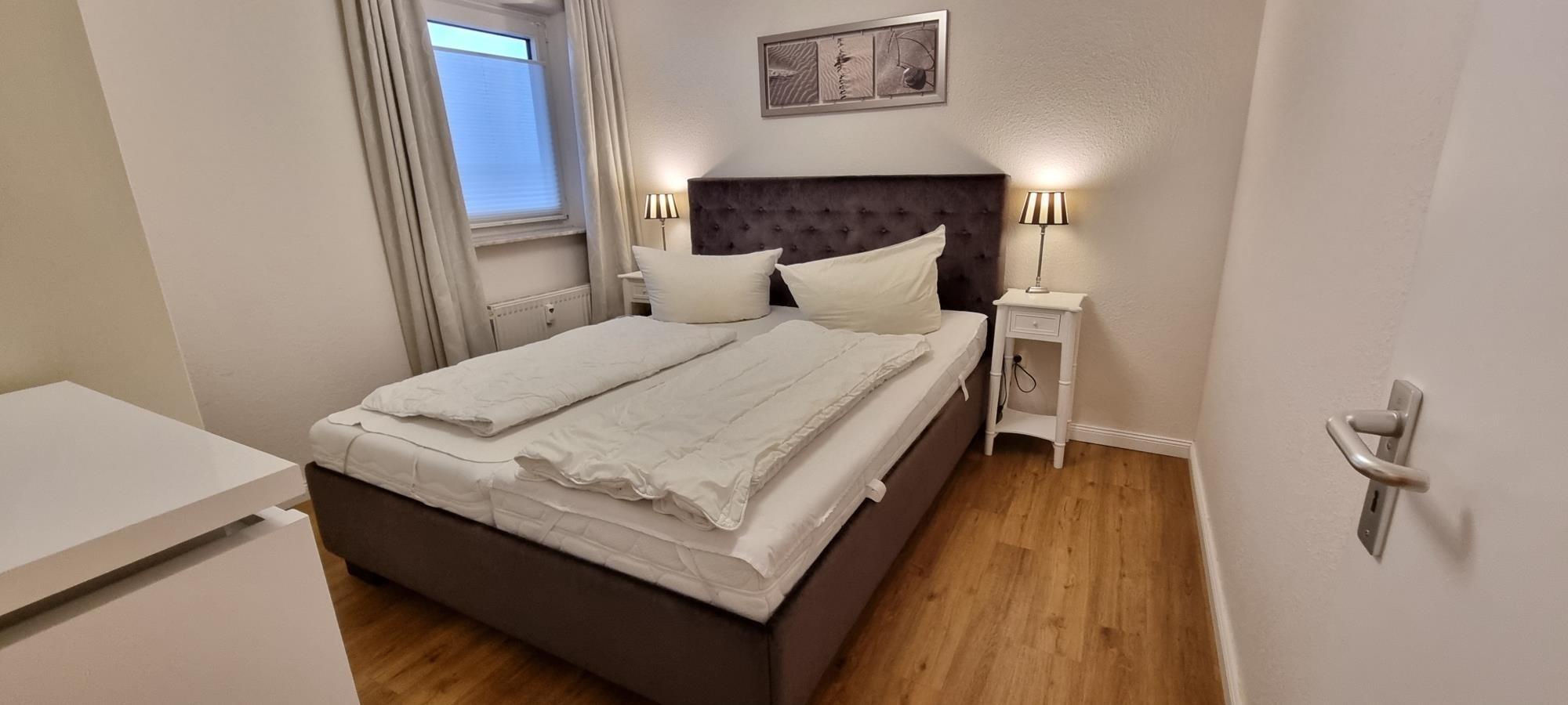Das separate Schlafzimmer ist mit einem komfortablen Doppelbett und einem geräumigen Kleiderschrank ausgestattet und sorgt für erholsame Nächte. Der kombinierte Wohnraum ist offen gestaltet und verfügt über eine voll ausgestattete Küchenzeile, die eine flexible Selbstverpflegung ermöglicht. Eine praktische Schlafcouch steht optional für weitere Gäste zur Verfügung.