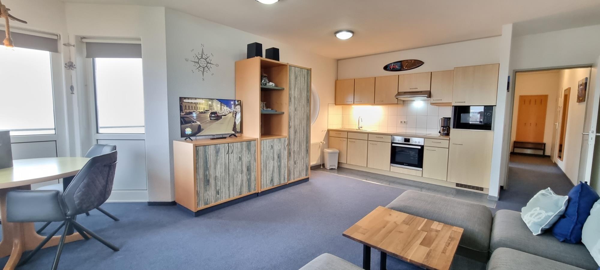 Das separate Schlafzimmer mit Doppelbett und Kleiderschrank sorgt für erholsame Nächte. Der kombinierte Wohnbereich mit Küchenzeile ermöglicht flexible Selbstverpflegung, während der westlich ausgerichtete Eckbalkon mit Balkonmöbeln zu entspannten Stunden bei Sonnenuntergang einlädt.