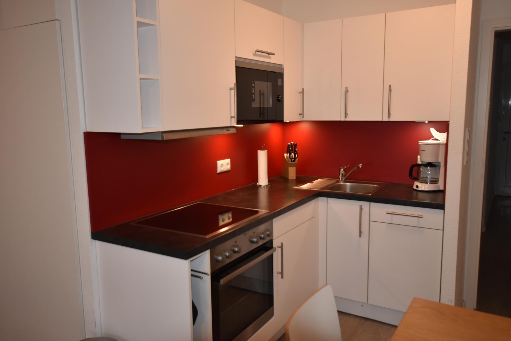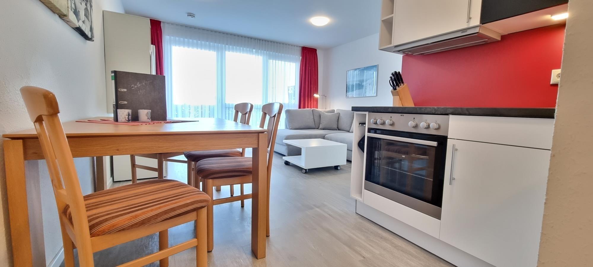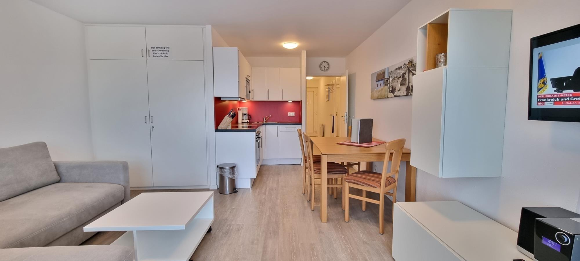 Im hellen Wohn- und Essbereich finden Sie eine gut ausgestattete Küchenzeile, einen Esstisch sowie ein bequemes Schlafsofa, das zwei zusätzliche Schlafplätze bietet. Das separate Schlafzimmer ist mit einem gemütlichen Doppelbett und einem geräumigen Kleiderschrank eingerichtet – ideal für längere Aufenthalte. Die funktional eingerichtete Küche bietet alles was Sie für eine Selbstversorgung benötigen.