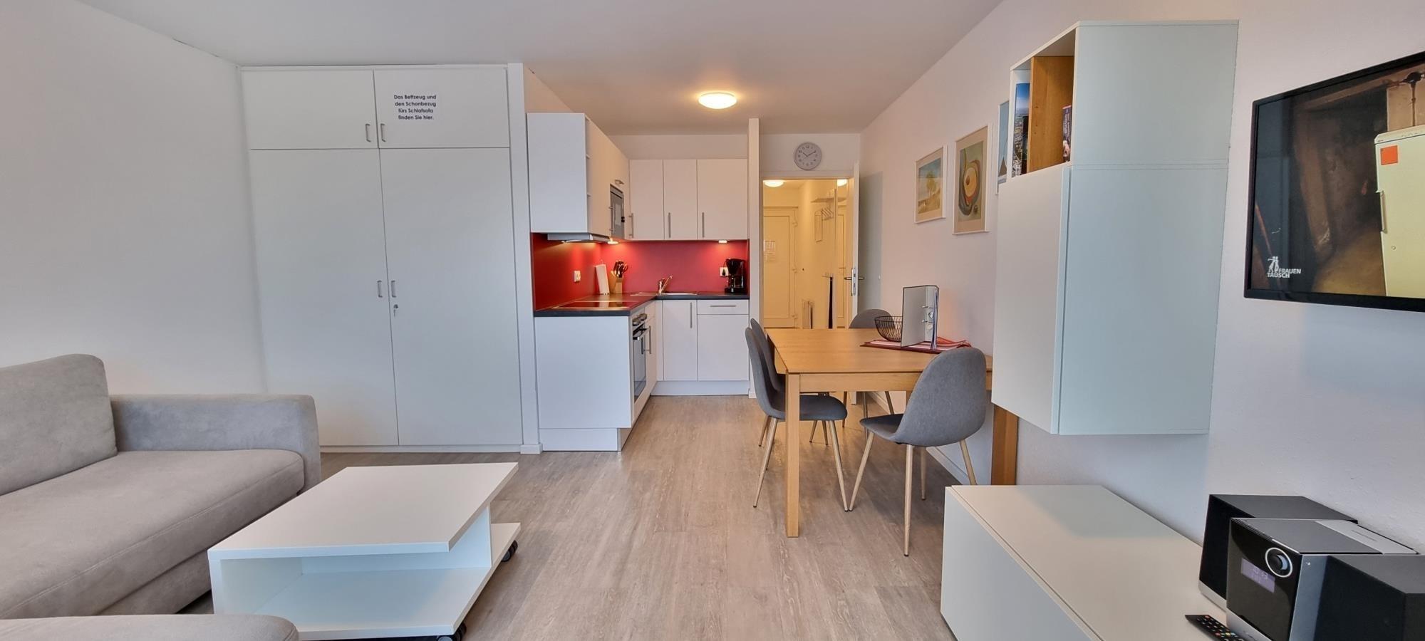 Unsere Ferienwohnung verfügt über eine voll ausgestattete Küchenzeile mit Cerankochfeld, Kühlschrank, Mikrowelle, Kaffeemaschine und Toaster – perfekt für die Selbstverpflegung. Der offene Wohnbereich ist gemütlich eingerichtet und bietet eine komfortable Schlafcouch, einen Essplatz sowie Flachbild-TV und kostenfreies WLAN.