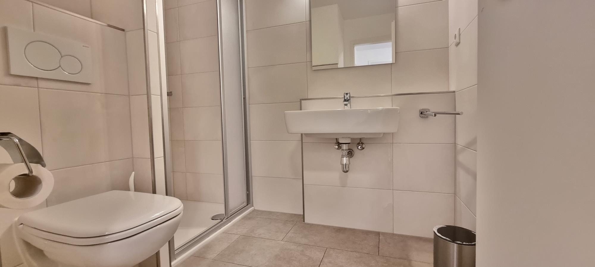 Das stilvoll eingerichtete Badezimmer verfügt über eine bodentiefe Dusche und hochwertige Ausstattung.