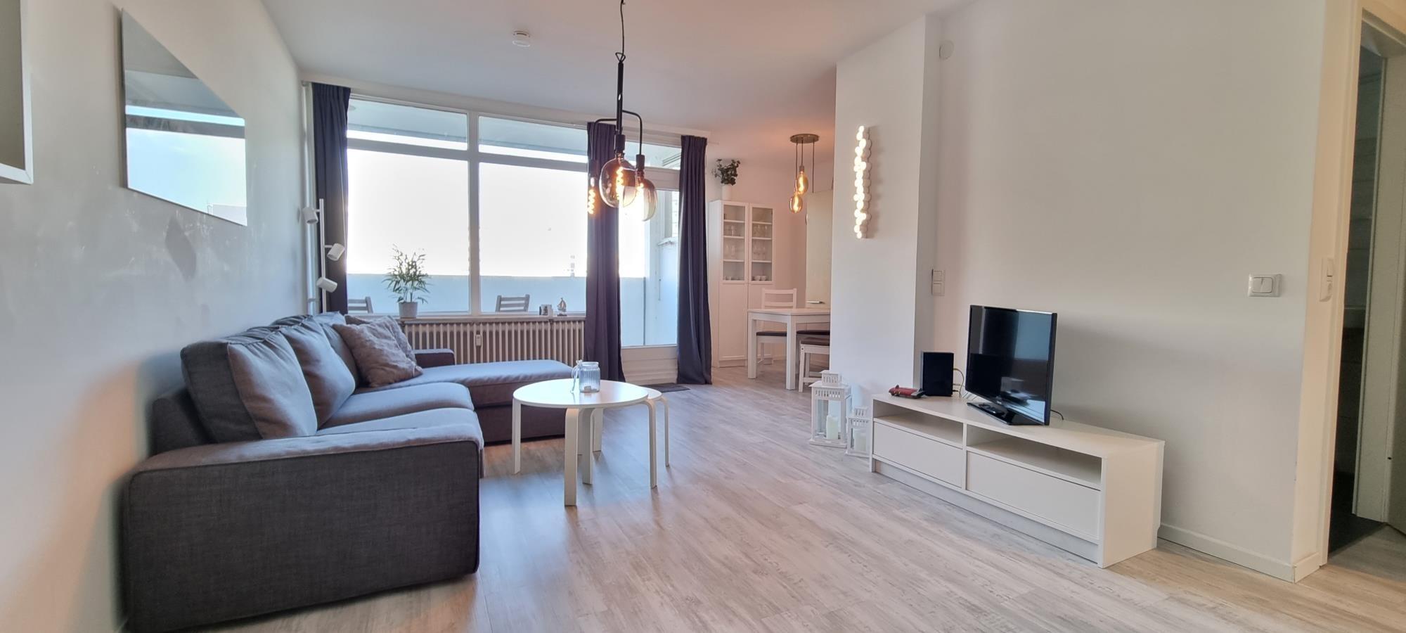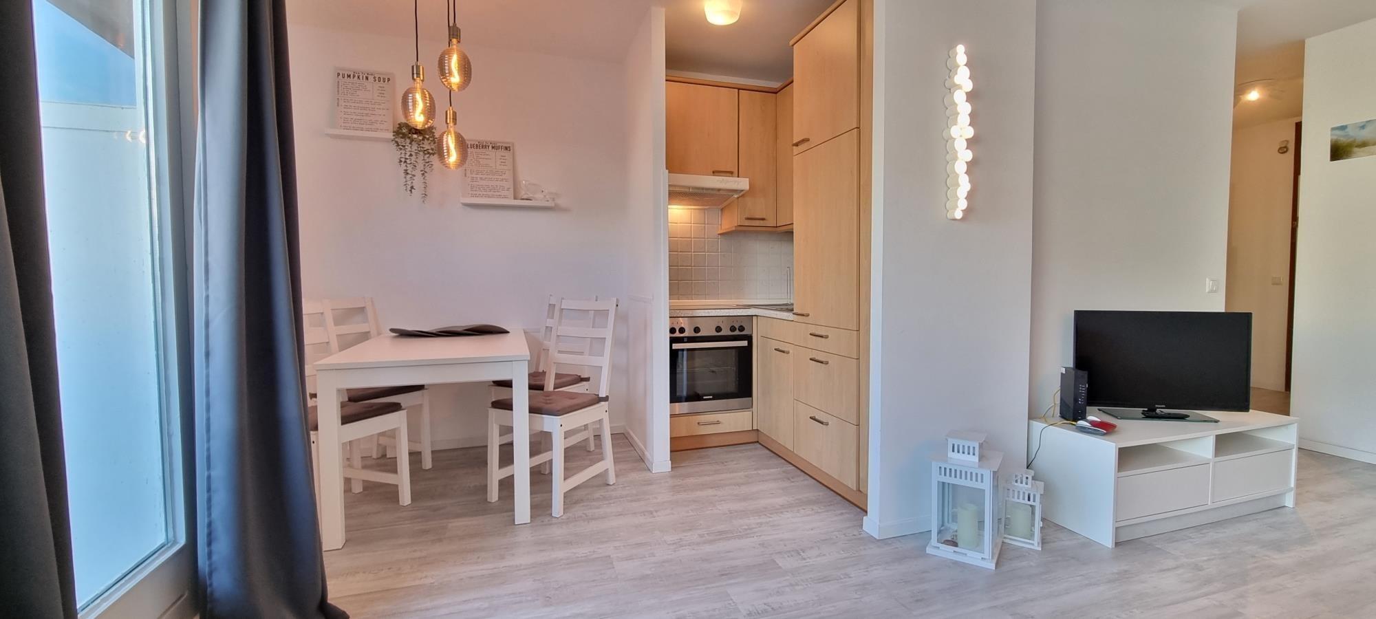 Das großzügige Wohnzimmer überzeugt mit einer stilvollen Sitzgruppe und einem Flachbild-TV, perfekt für entspannte Abende nach einem erlebnisreichen Tag. Vom Balkon aus genießen Sie einen seitlichen Blick auf die Ostsee und können die frische Meeresluft in vollen Zügen erleben. Kostenfreies WLAN steht Ihnen selbstverständlich in der gesamten Wohnung zur Verfügung.