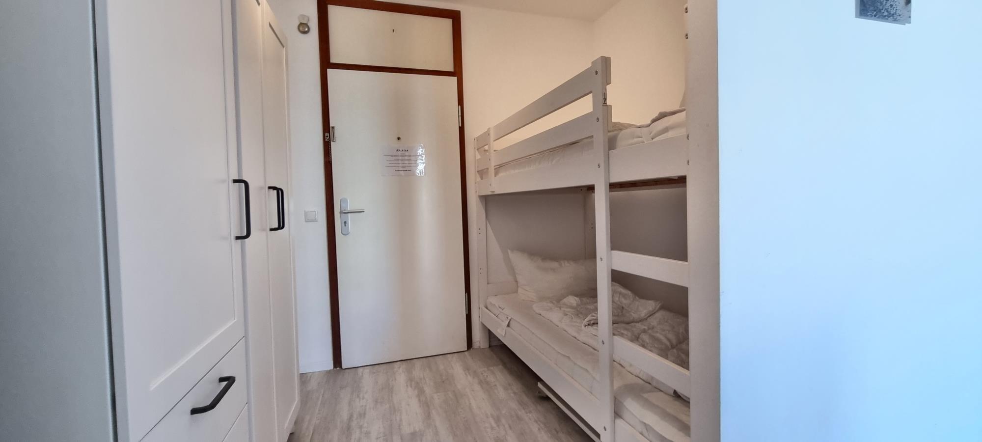 Der gemütliche Schlafbereich ist mit einem komfortablen Doppelbett ausgestattet und sorgt für erholsame Nächte. Eine zusätzliche Schlafnische mit Etagenbett im Korridor ist ideal für Kinder und macht die Wohnung besonders familienfreundlich.