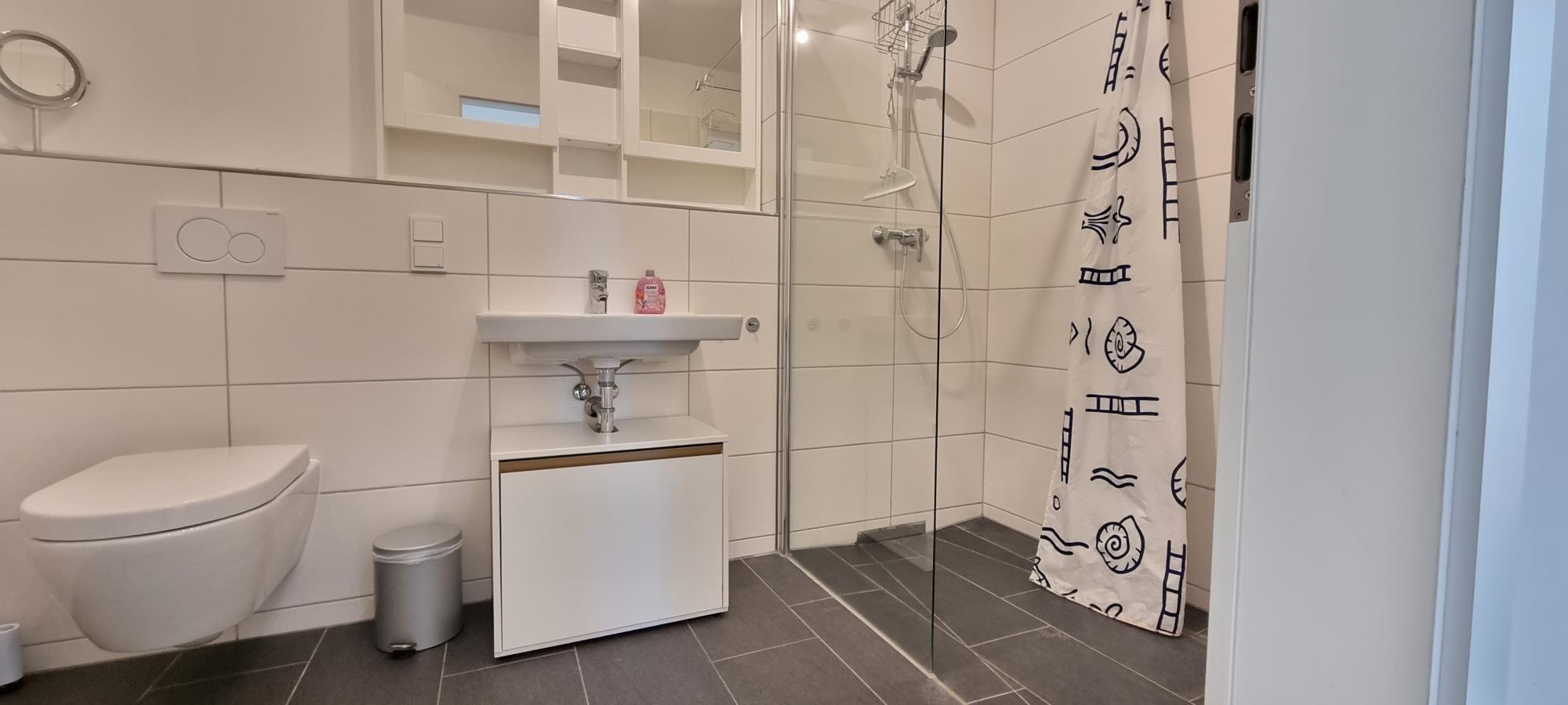 Das moderne Badezimmer ist stilvoll gestaltet und verfügt über eine ebenerdige Dusche, Fußbodenheizung sowie eine Handtuchheizung. Ein Spiegelschrank, ein Fön und eine Steckdose am Waschplatz runden die Ausstattung ab.