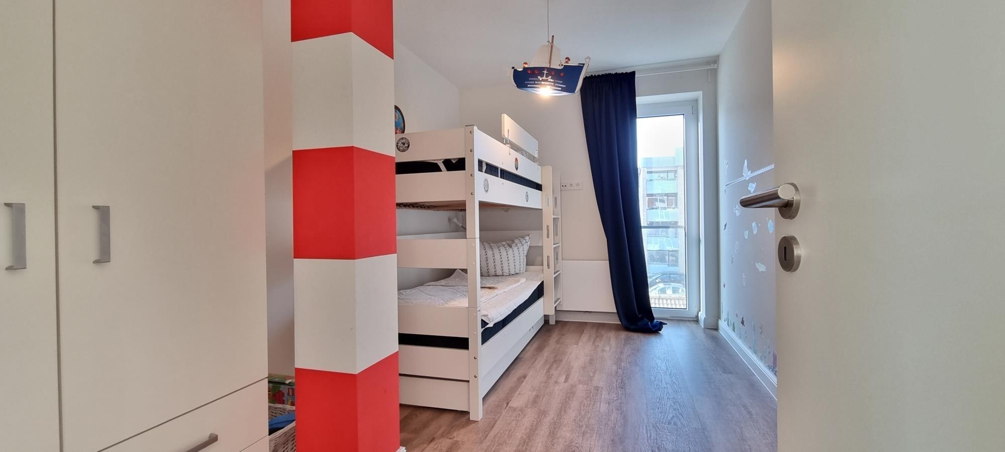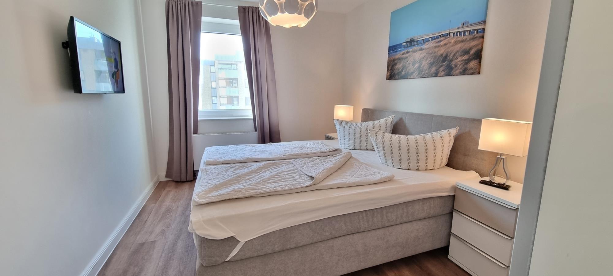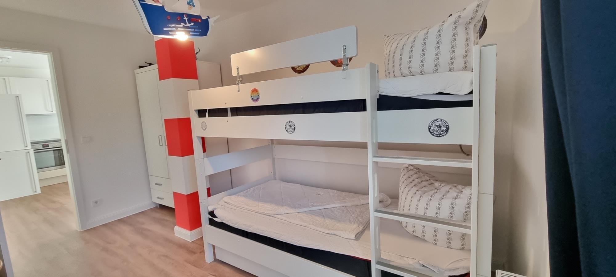 Die Wohnung verfügt über zwei komfortable Schlafzimmer mit Schlafplätzen für insgesamt vier Personen. Im ersten Schlafzimmer erwartet Sie ein hochwertiges Boxspring-Doppelbett (180x200 cm), während das zweite Schlafzimmer mit einem praktischen Stockbett (je 90x200 cm) ausgestattet ist. Beide Räume bieten Kleiderschränke sowie Verdunkelungsmöglichkeiten für erholsamen Schlaf.