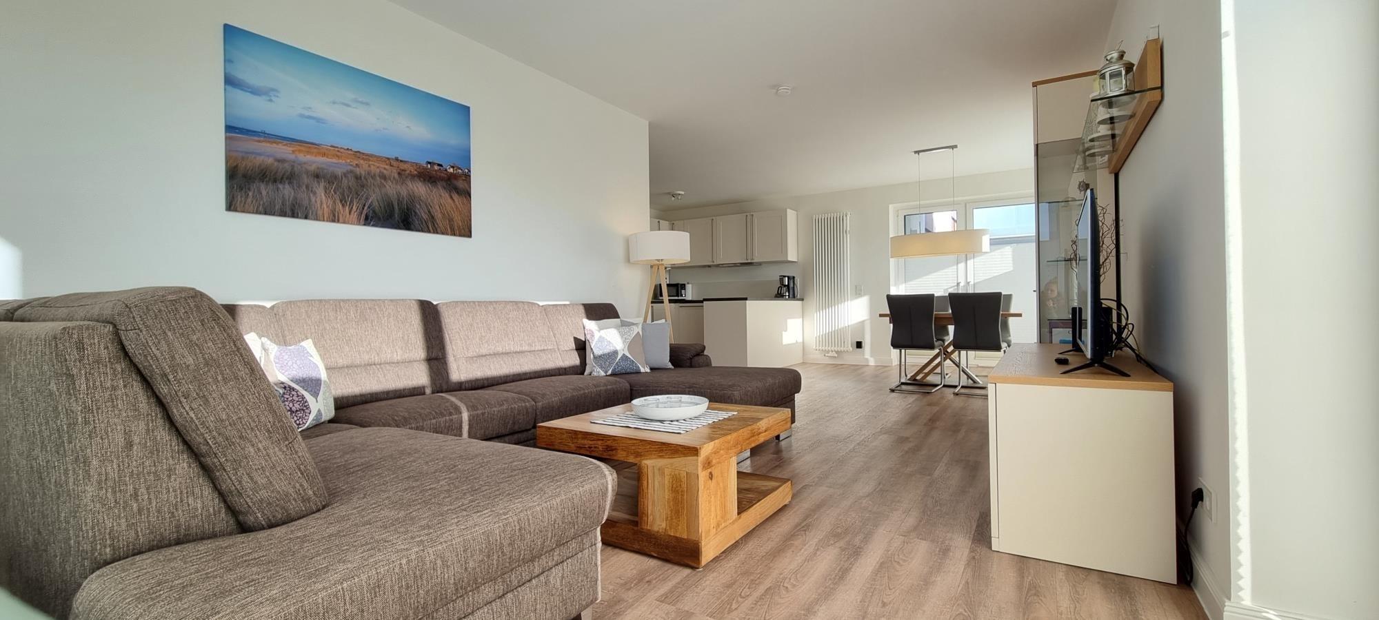 Der großzügige Wohn- und Essbereich überzeugt durch seine helle, lichtdurchflutete Atmosphäre und lädt mit einer gemütlichen Sofaecke zum Entspannen ein. Ein moderner Smart-TV sowie Wohnzimmerschränke mit einer Auswahl an Gesellschaftsspielen sorgen für Unterhaltung bei jedem Wetter. Der große Esstisch bietet Platz für bis zu vier Personen, ist bei Bedarf ausziehbar und wird durch einen praktischen Kinderhochstuhl ergänzt.