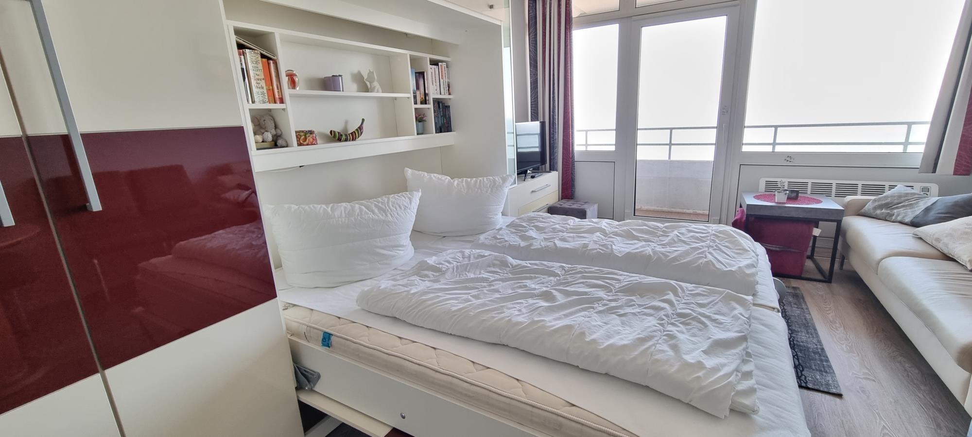 Dieses moderne Nichtraucher-Studio im 6. Obergeschoss bietet die perfekte Kombination aus Komfort, Lage und traumhaftem Ausblick für einen erholsamen Urlaub an der Ostsee. Dank des vorhandenen Fahrstuhls erreichen Sie die Wohnung bequem und barrierearm. Die Unterkunft ist ideal für bis zu zwei Personen und überzeugt mit einem clever gestalteten Wohn- und Schlafbereich, der mit hochwertigen Schrankklappbetten ausgestattet ist. So genießen Sie tagsüber ein großzügiges Raumgefühl und verwandeln den Bereich nachts im Handumdrehen in eine gemütliche Schlafzone.