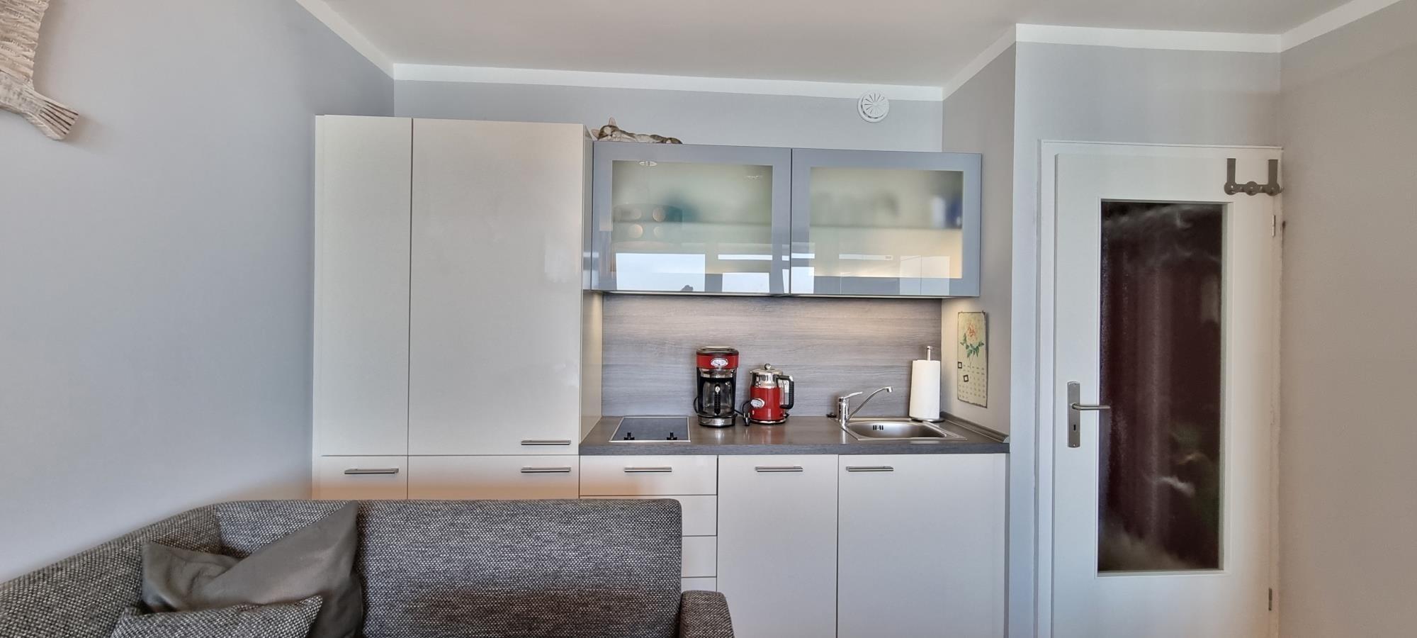 Die Küchenzeile ist kompakt, aber erstaunlich gut ausgestattet – inklusive Induktionskochfeld, Kühlschrank, Kaffeemaschine und allem, was Sie für den Urlaub brauchen.