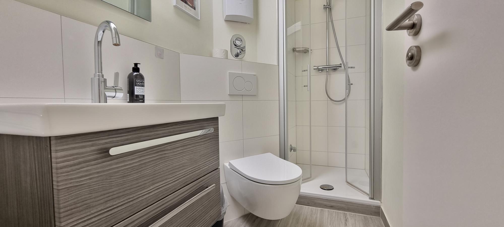 Das stilvolle Duschbad wurde 2022 vollständig saniert und bietet modernen Komfort inklusive angenehmer Fußbodenheizung. Für zusätzlichen Komfort ist WLAN bereits im Mietpreis enthalten, sodass Sie jederzeit online bleiben können – ideal auch für längere Aufenthalte oder Workation.