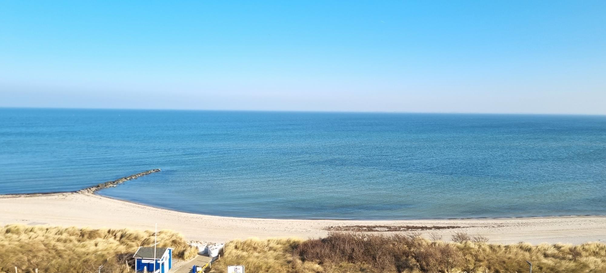 Ein absolutes Highlight ist der Balkon mit spektakulärem Ostseeblick, der an klaren Tagen sogar bis nach Fehmarn reicht. Hier können Sie den Sonnenaufgang bei einer Tasse Kaffee genießen oder den Tag entspannt ausklingen lassen. Die kompakte, moderne Küchenzeile ist funktional eingerichtet und verfügt über ein Induktionskochfeld, sodass Sie sich bequem selbst versorgen können.