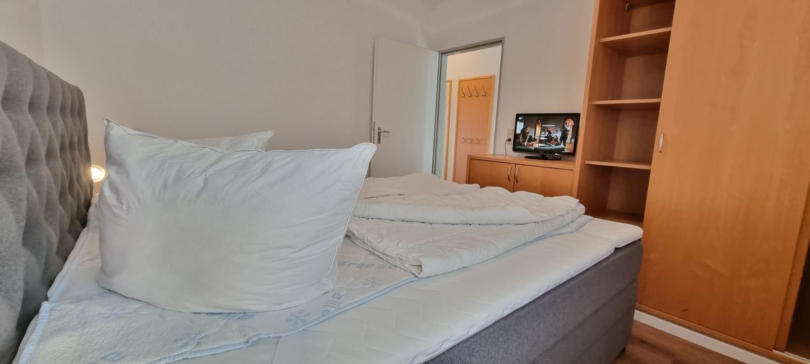 Das separate Schlafzimmer mit Doppelbett und Kleiderschrank sorgt für entspannte Nächte. Der Wohnbereich bietet eine Schlafcouch, die Platz für 1–2 zusätzliche Personen bietet. Die kombinierte Küchenzeile im Wohnraum ermöglicht flexible Selbstversorgung während Ihres Aufenthalts.