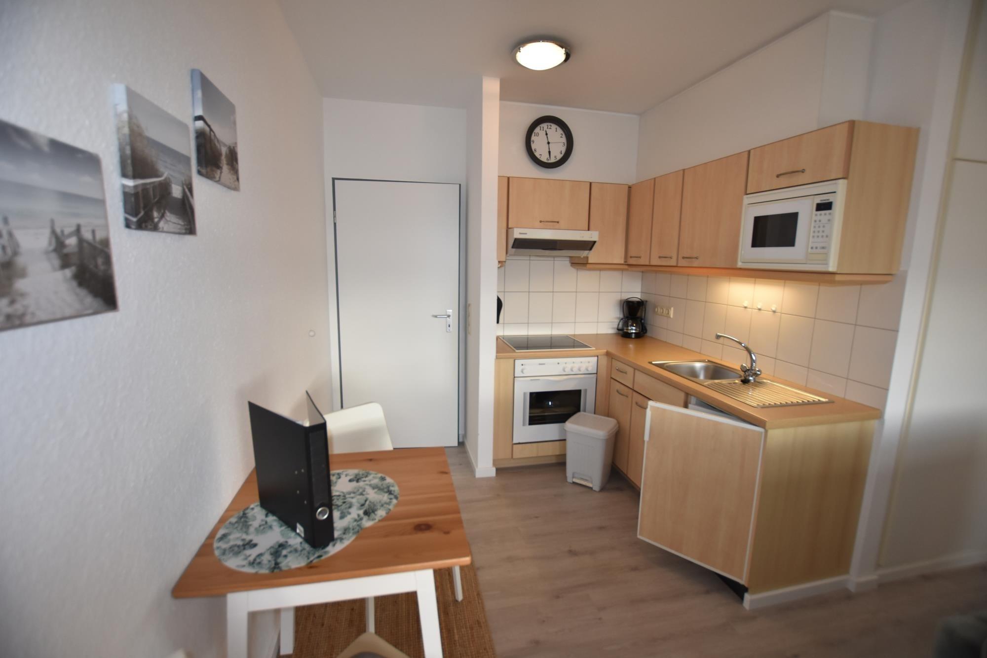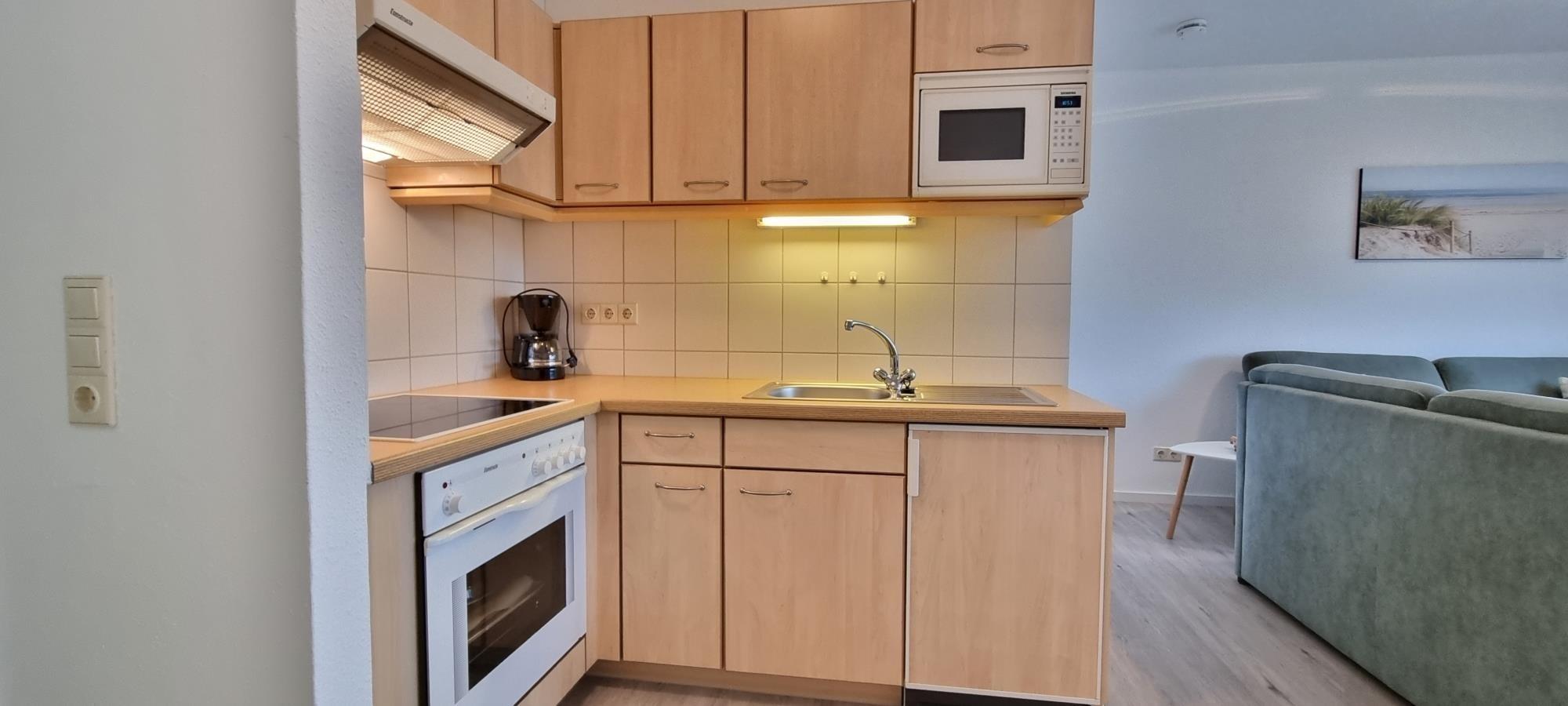 Das separate Schlafzimmer mit komfortablem Doppelbett und geräumigem Kleiderschrank sorgt für erholsame Nächte. Der helle Wohnbereich mit integrierter Küchenzeile ist bestens ausgestattet für die Selbstversorgung. Vom möblierten Balkon zur Binnenseeseite genießen Sie einen weiten Blick auf das Wasser, beobachten das Lichtspiel der Natur und können den Tag entspannt ausklingen lassen.