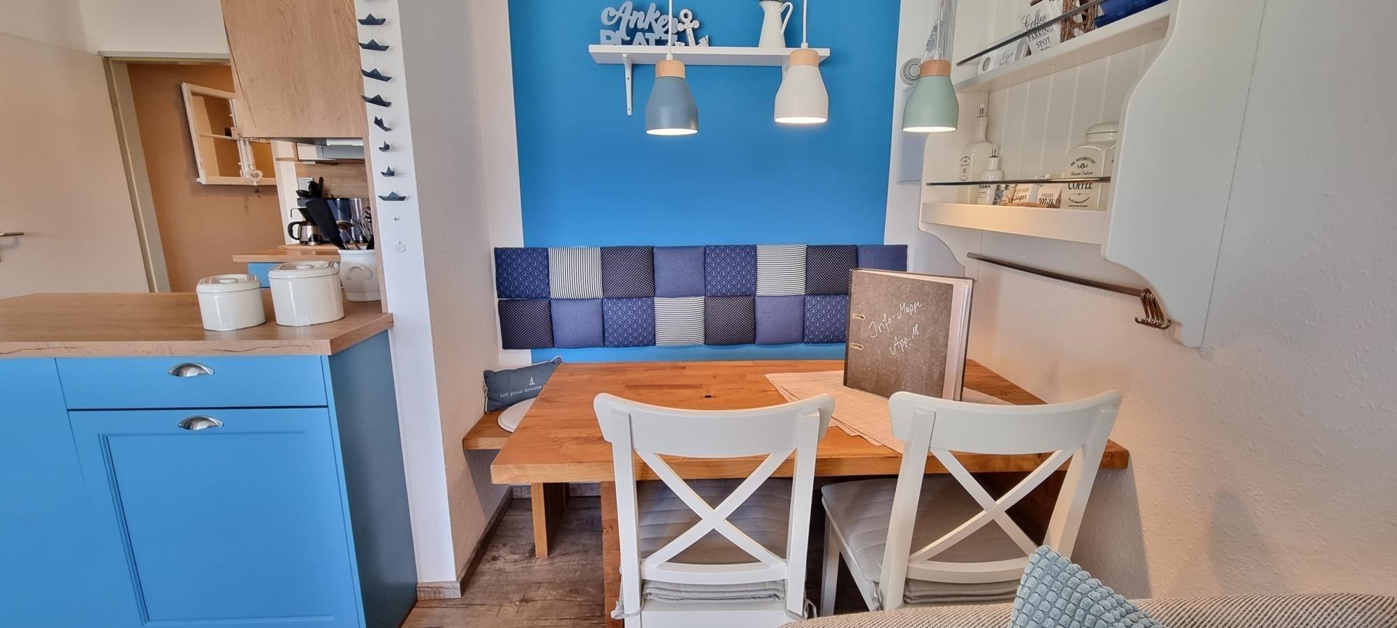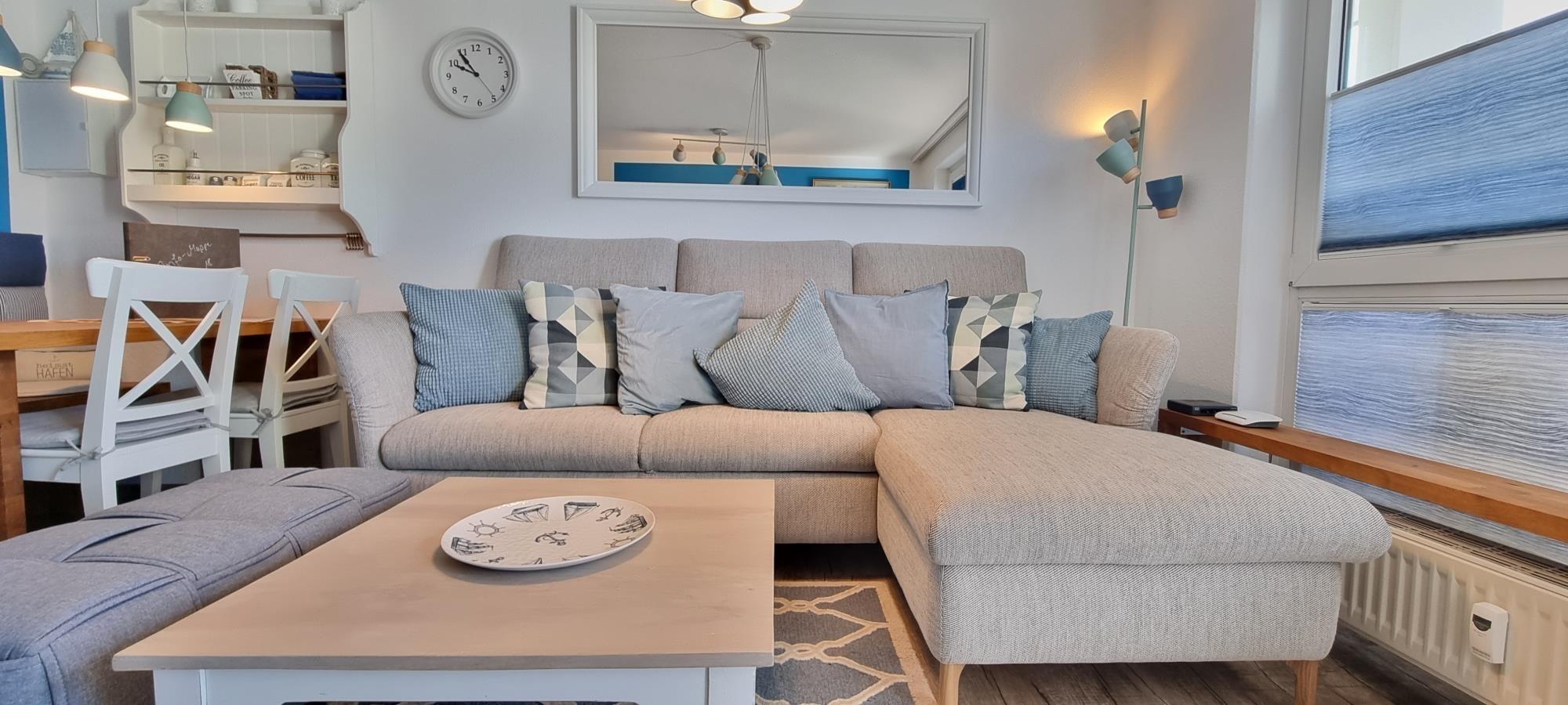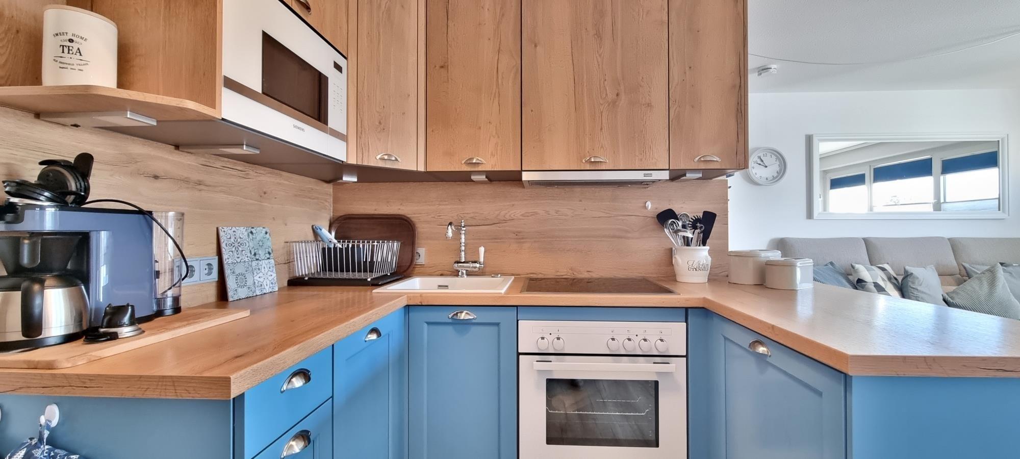Der offene Wohn- und Küchenbereich ist hell und einladend. In der voll ausgestatteten Küchenzeile können Sie Mahlzeiten bequem selbst zubereiten. Die komfortable Couch im Wohnbereich lässt sich einfach in eine zusätzliche Schlafgelegenheit verwandeln, sodass bis zu 3 Gäste bequem untergebracht werden können.
