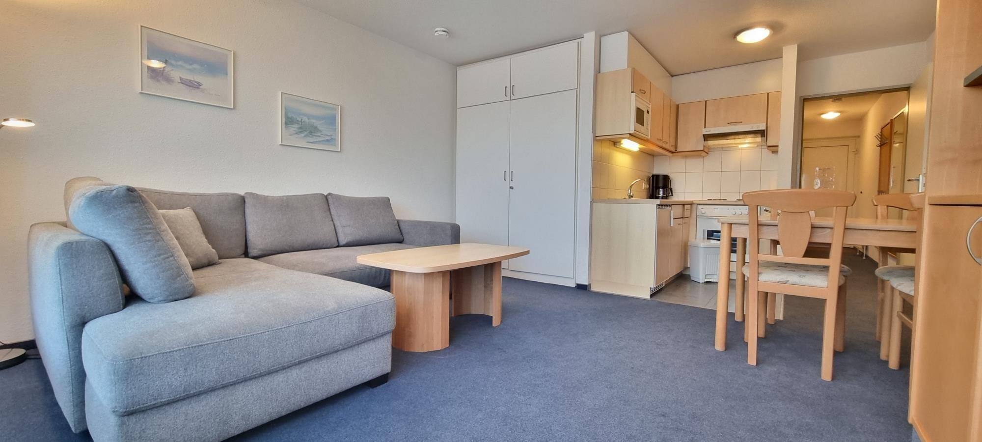 Die Wohnung bietet ein separates Schlafzimmer mit Doppelbett, einen offen gestalteten Wohn- und Essbereich mit Küchenzeile und ein komfortables Schlafsofa für zwei weitere Gäste. Flachbild-TV, ein eigener Parkplatz und die gute Erreichbarkeit mit öffentlichen Verkehrsmitteln machen den Aufenthalt besonders angenehm.