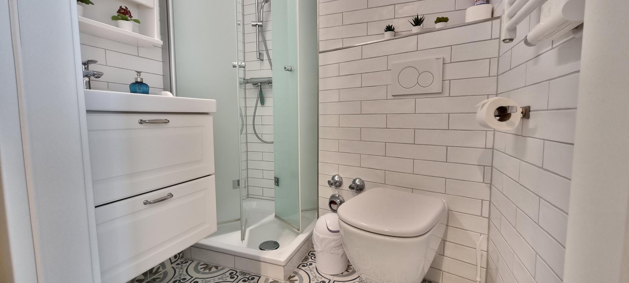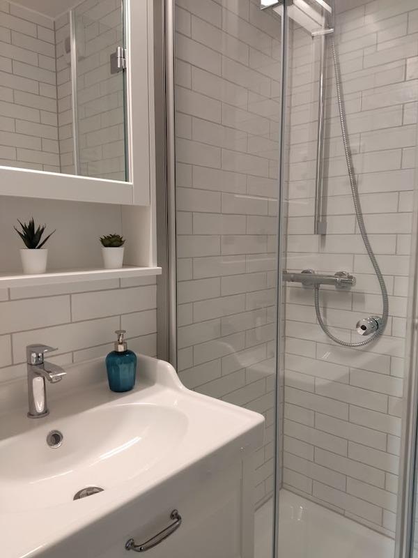 Das Duschbad überzeugt durch seine hygienische und pflegeleichte Ausstattung ohne Teppichboden. Klare Linien und moderne Elemente sorgen für ein angenehmes Ambiente.