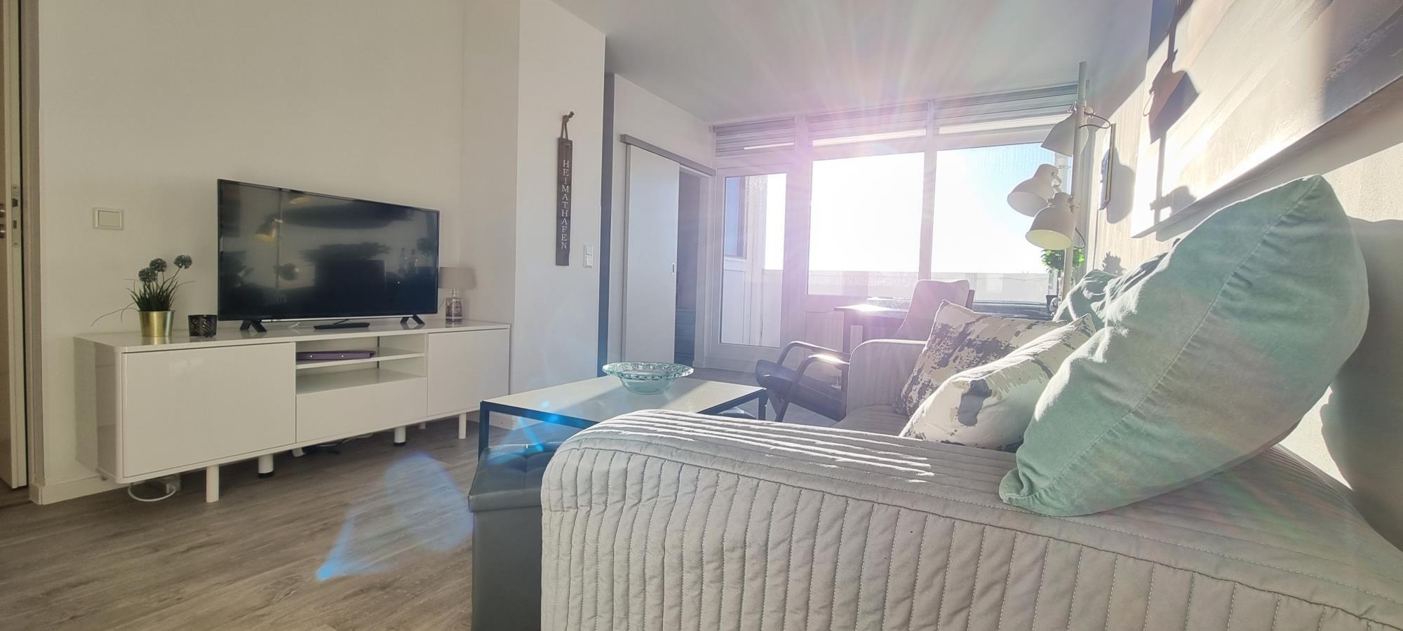 Der helle und freundlich gestaltete Wohnraum lädt zum Verweilen ein. Eine bequeme Couch sowie ein moderner Flachbildfernseher bieten Ihnen besten Komfort für entspannte Abende. Große Fenster sorgen für viel Tageslicht und schaffen eine angenehme Wohlfühlatmosphäre.