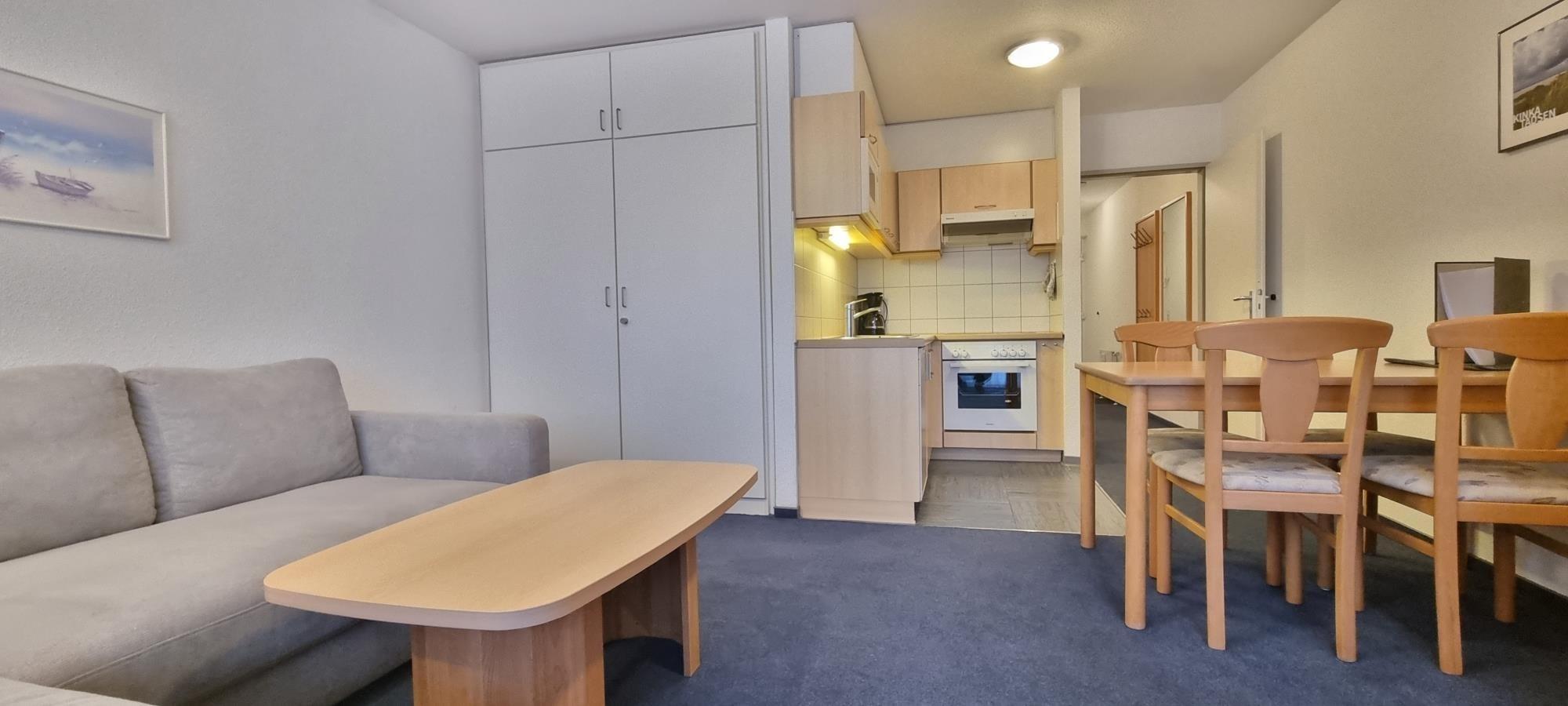 Im separaten Schlafzimmer erwartet Sie ein gemütliches Doppelbett sowie ein großer Kleiderschrank für ausreichend Stauraum. Der offene Wohnbereich ist mit einer praktischen Küchenzeile, einem Essbereich und einer bequemen Couch mit Schlaffunktion ausgestattet – ideal für bis zu 4 Personen.