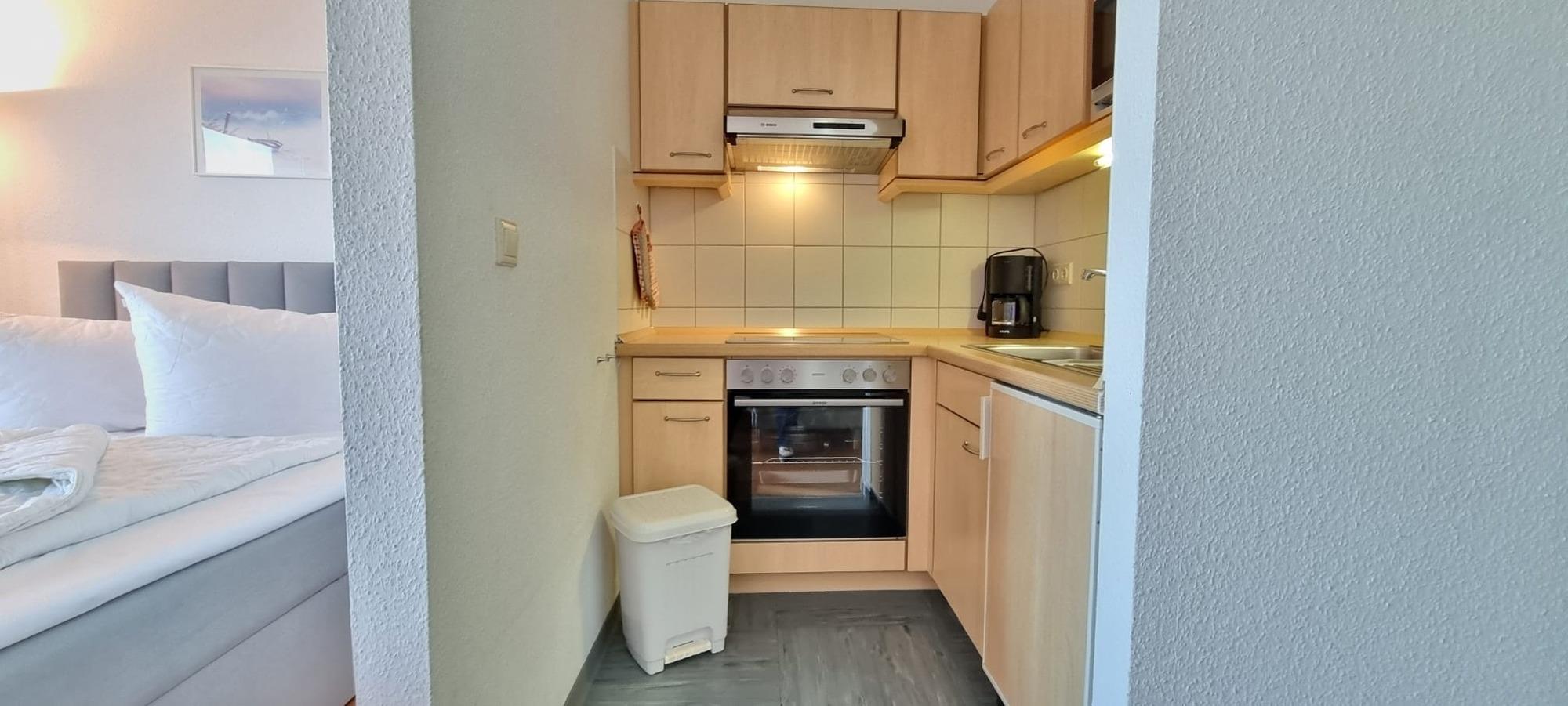 Die integrierte Küchenzeile befindet sich ebenfalls im Wohnraum und bietet alles, was Sie für eine unkomplizierte Selbstverpflegung im Urlaub benötigen.