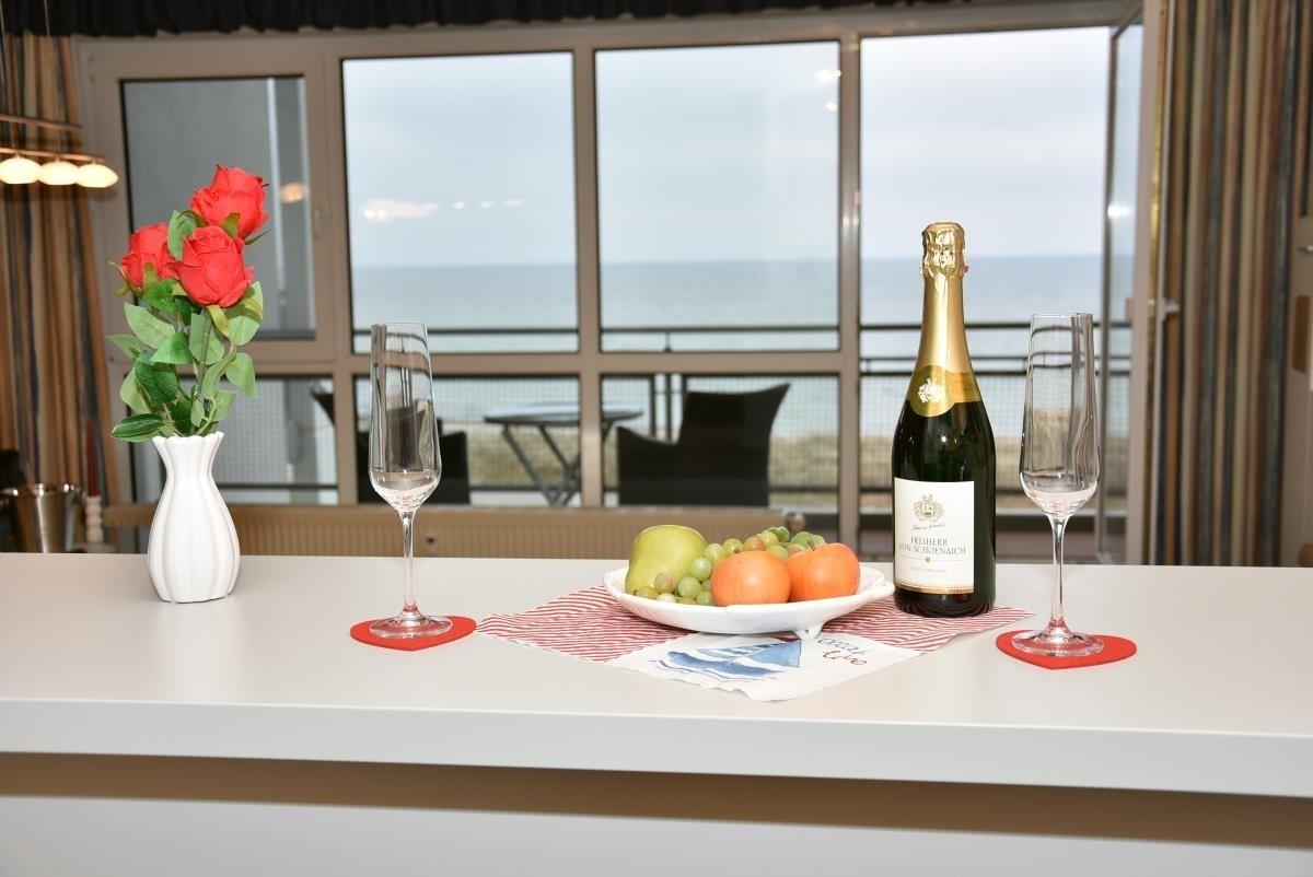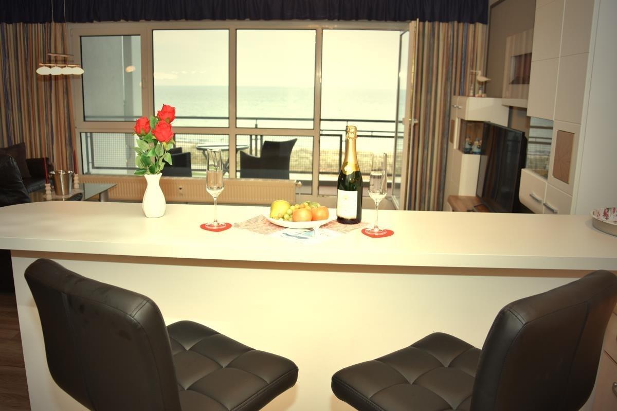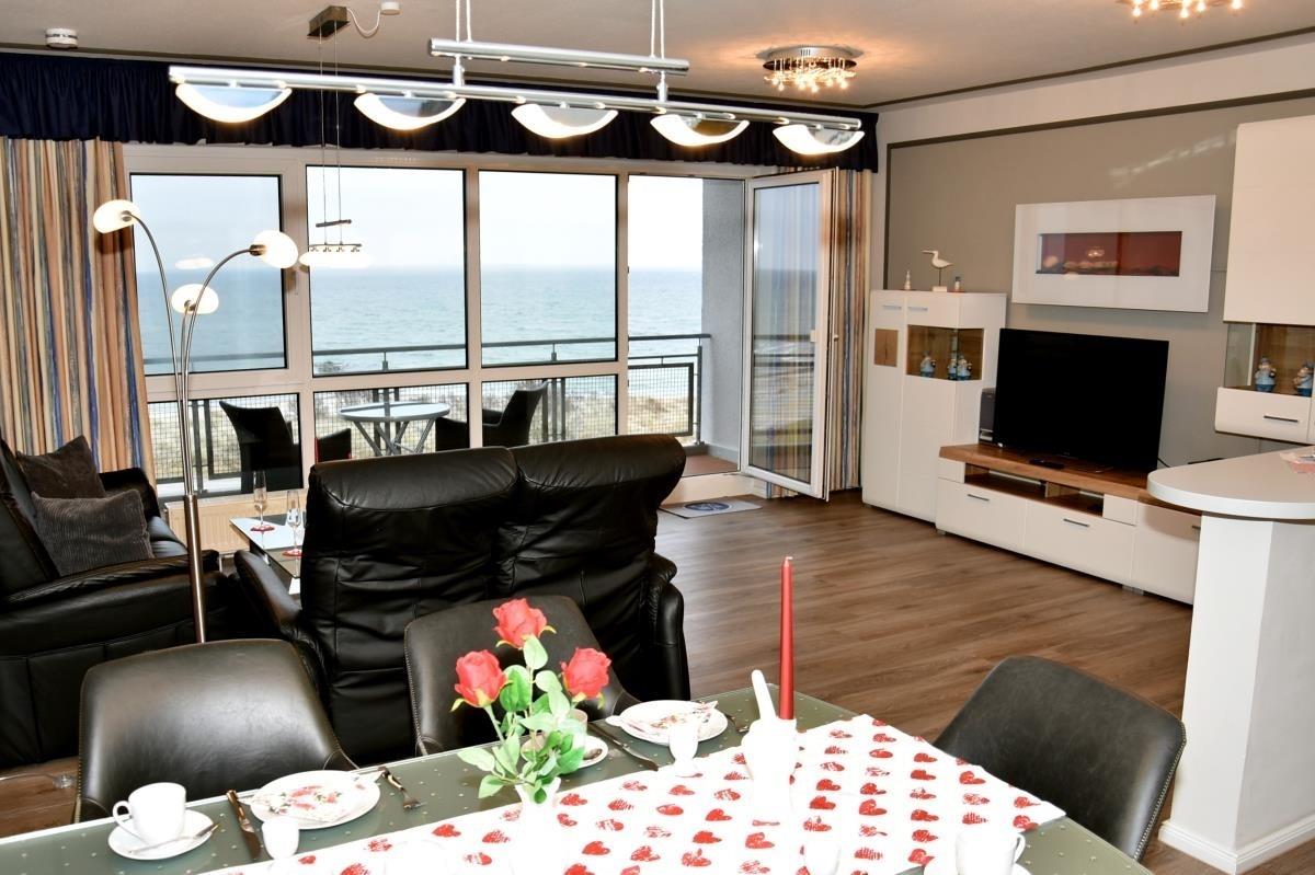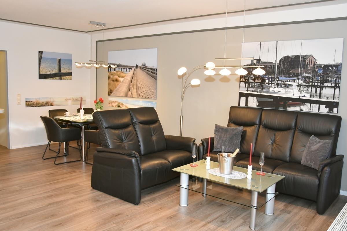 Der helle Wohnbereich ist mit offener Küche, Esstisch und gemütlicher Sofaecke ausgestattet und lädt zum Entspannen nach einem Strandspaziergang ein. Die Wohnung verfügt über zwei separate Schlafzimmer, eines davon mit hochwertigem Boxspringbett, das erholsamen Schlaf garantiert. Für zusätzliche Gäste bietet die Sofaecke im Wohnzimmer eine bequeme Schlafmöglichkeit.