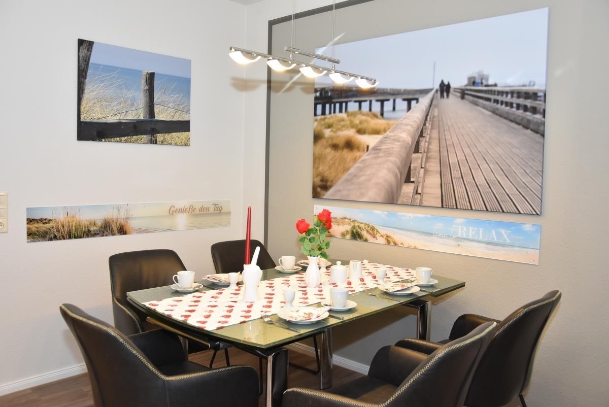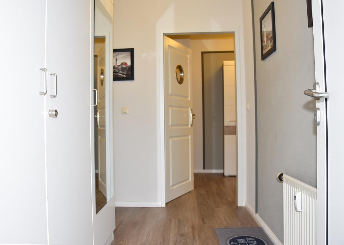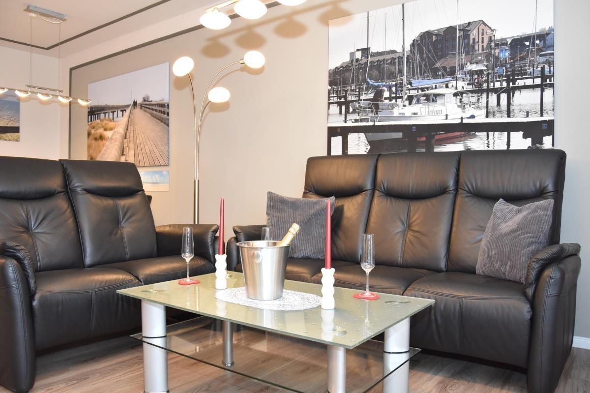 Der helle Wohnbereich ist mit offener Küche, Esstisch und gemütlicher Sofaecke ausgestattet und lädt zum Entspannen nach einem Strandspaziergang ein. Die Wohnung verfügt über zwei separate Schlafzimmer, eines davon mit hochwertigem Boxspringbett, das erholsamen Schlaf garantiert. Für zusätzliche Gäste bietet die Sofaecke im Wohnzimmer eine bequeme Schlafmöglichkeit.