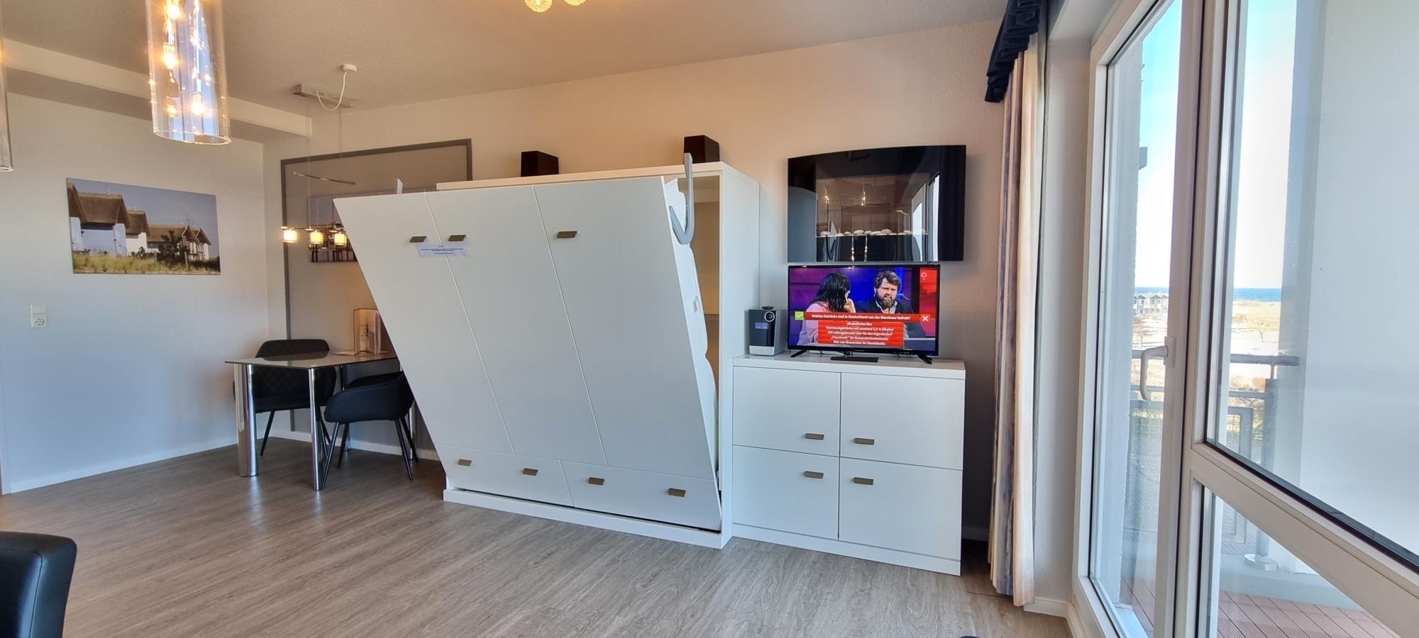 Der Wohnbereich ist durchdacht gestaltet und verfügt über ein praktisches Schrankbett, das tagsüber für mehr Raum sorgt und abends komfortablen Schlaf bietet. So entsteht eine optimale Kombination aus Funktionalität und Wohnkomfort.