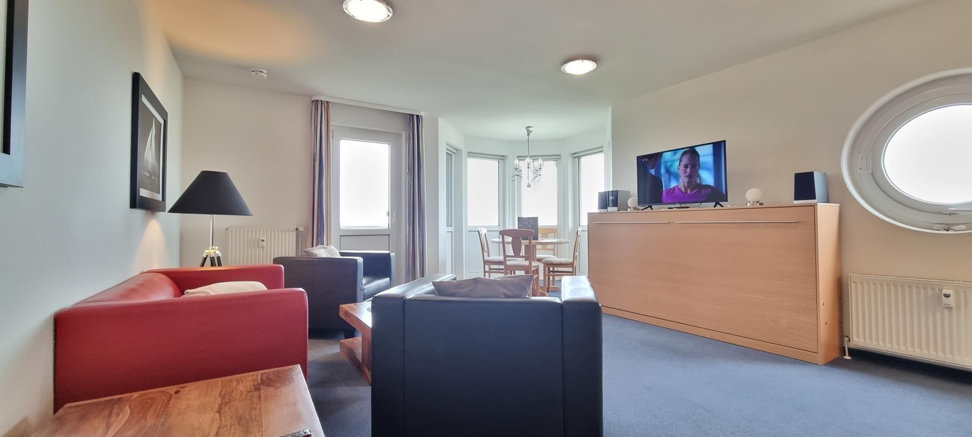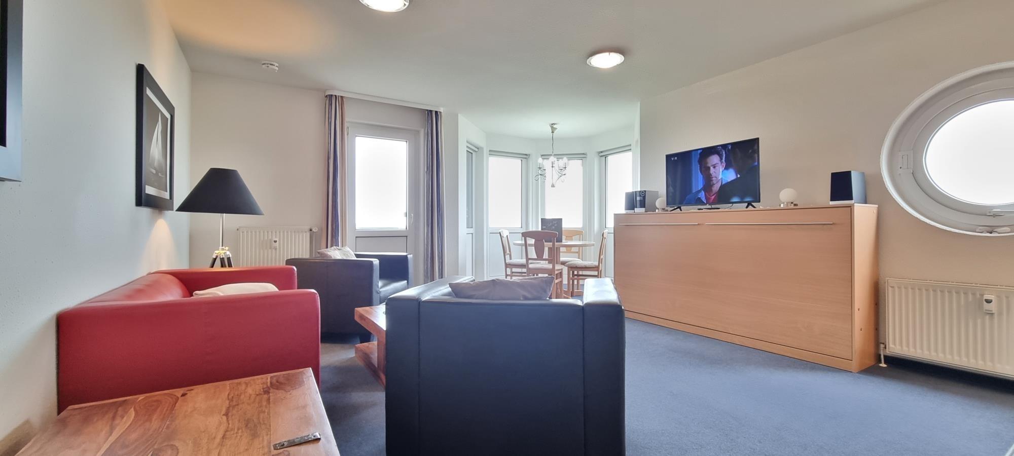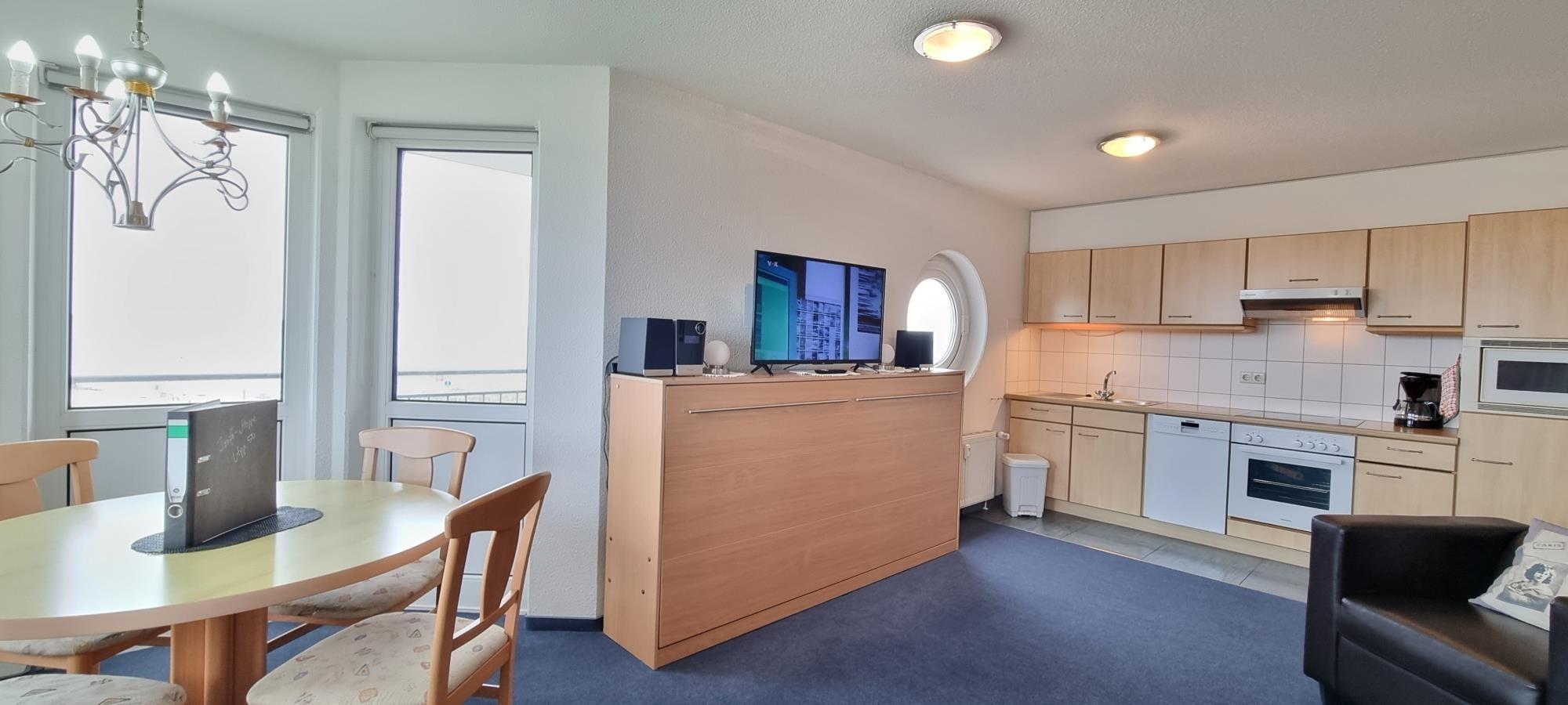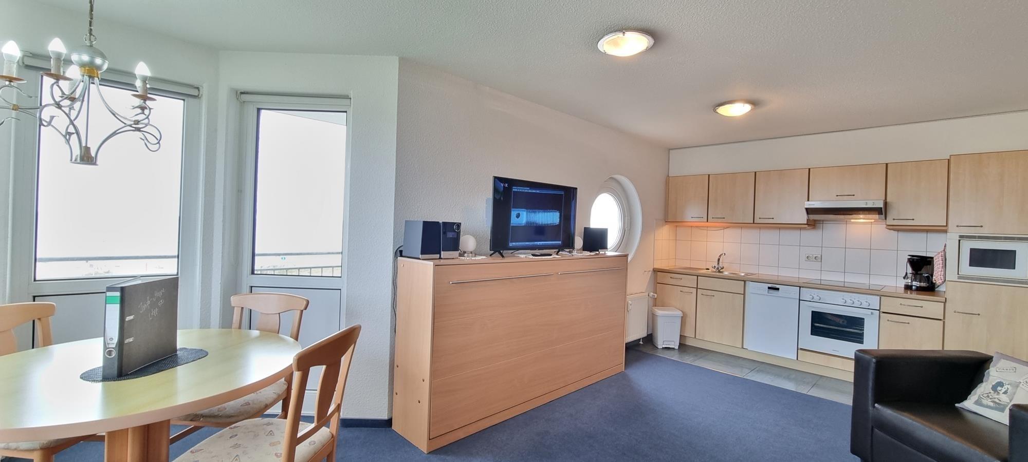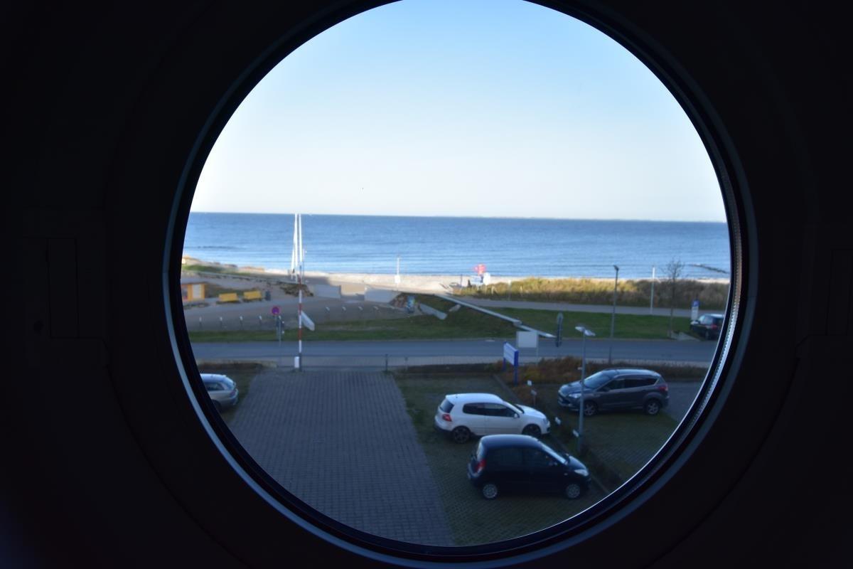 Erleben Sie unvergessliche Urlaubstage in Ferienwohnung 50, Ihrer charmanten Unterkunft in Heiligenhafen. Ideal für bis zu 3 Personen bietet diese Wohnung die perfekte Kombination aus Ruhe, Komfort und einzigartigem Ausblick auf die Ostsee und die umliegende Landschaft. Das separate Schlafzimmer verfügt über ein Fenster mit direktem Blick auf das Wasser und sorgt für erholsamen Schlaf. Im offenen Wohnbereich befindet sich ein Schrankklappbett, das eine zusätzliche Schlafmöglichkeit für eine dritte Person bietet – ideal für kleine Familien oder Freunde.