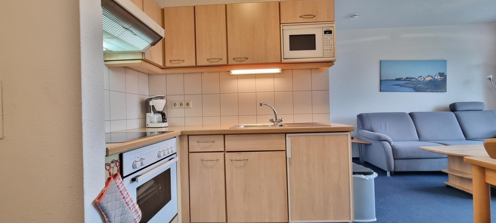 Das separate Schlafzimmer mit Doppelbett und Kleiderschrank sorgt für erholsame Nächte. Der helle Wohnbereich verfügt über eine Küchenzeile mit Esstisch sowie eine Schlafcouch für zwei weitere Gäste, sodass die Ferienwohnung flexibel nutzbar ist. Das moderne Duschbad rundet die Ausstattung ab.