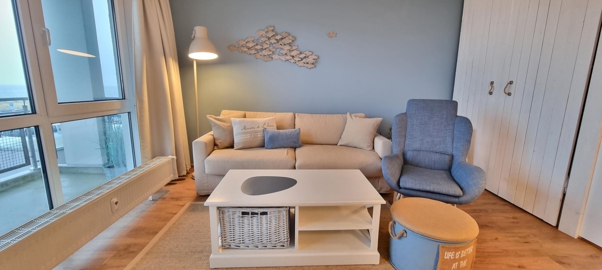 Das Appartement befindet sich im 2. Obergeschoss und bietet einen traumhaften Blick auf die Ostsee. Sie ist ideal für 2 Personen – ein Kleinkind bis 5 Jahre kann auf der Schlafcouch im Wohnbereich mit untergebracht werden.