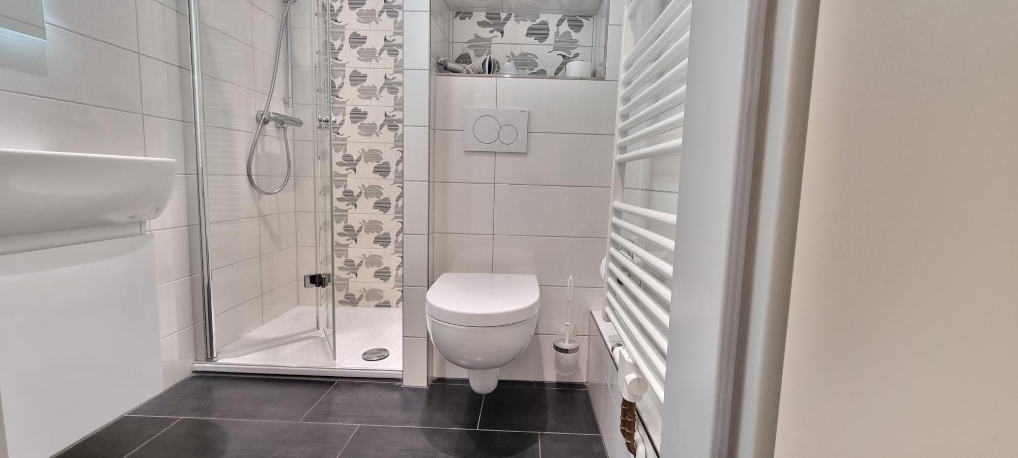 Das moderne Duschbad rundet die funktionale Ausstattung ab und sorgt für einen entspannten Start in den Tag.
