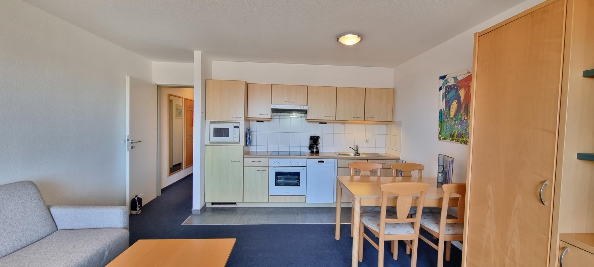 Das separate Schlafzimmer ist mit einem komfortablen Doppelbett (zwei Einzelmatratzen à 80 cm) ausgestattet und sorgt für erholsame Nächte. Im offenen Wohnbereich erwartet Sie eine gemütliche Sitzecke sowie eine integrierte Küchenzeile, die alles für einen angenehmen Aufenthalt bereithält. Besonders praktisch: Die Küche verfügt über einen Geschirrspüler und bietet damit zusätzlichen Komfort im Urlaub.