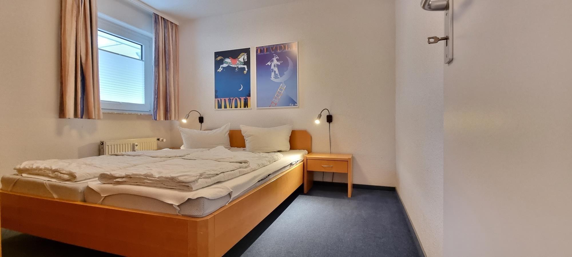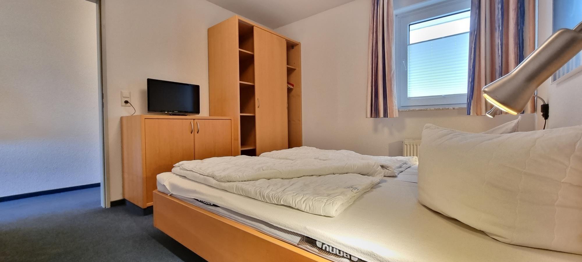 Das separate Schlafzimmer ist mit einem komfortablen Doppelbett und einem geräumigen Kleiderschrank ausgestattet. Der Wohnbereich bietet ein bequemes Schlafsofa, ideal für eine dritte Person oder zum Entspannen nach einem Tag voller Erlebnisse. Der kombinierte Wohn- und Essbereich mit Küchenzeile ist funktional eingerichtet und umfasst Kochgelegenheit, Kühlschrank, Kaffeemaschine und Wasserkocher – perfekt für eine unkomplizierte Selbstversorgung. Ein moderner Flachbild-TV sorgt für Unterhaltung.