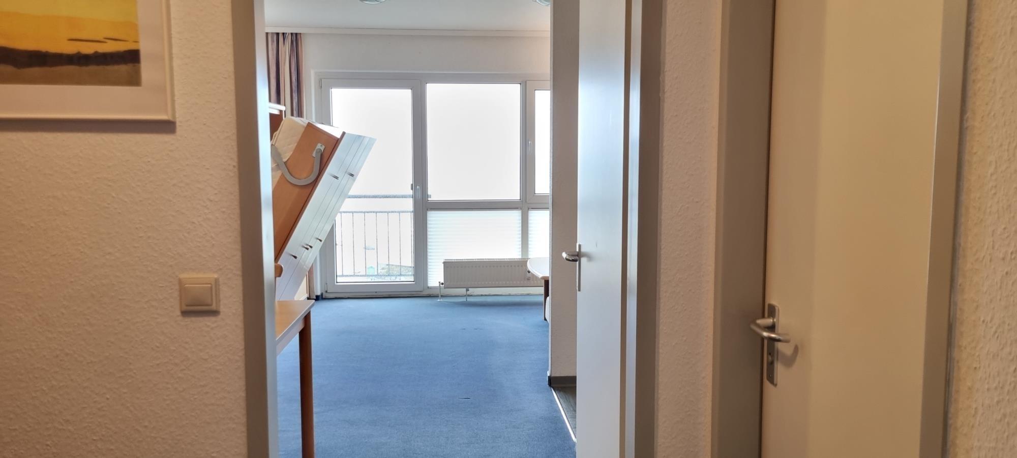 Der kombinierte Wohn- und Schlafbereich ist kompakt und praktisch gestaltet. Ein platzsparendes Schrankbett bietet komfortablen Schlaf für zwei Personen und sorgt tagsüber für mehr Bewegungsfreiheit. Vom französischen Balkon aus – ohne Sitzmöglichkeit – genießen Sie frische Ostseeluft und einen schönen Blick Richtung Meer.