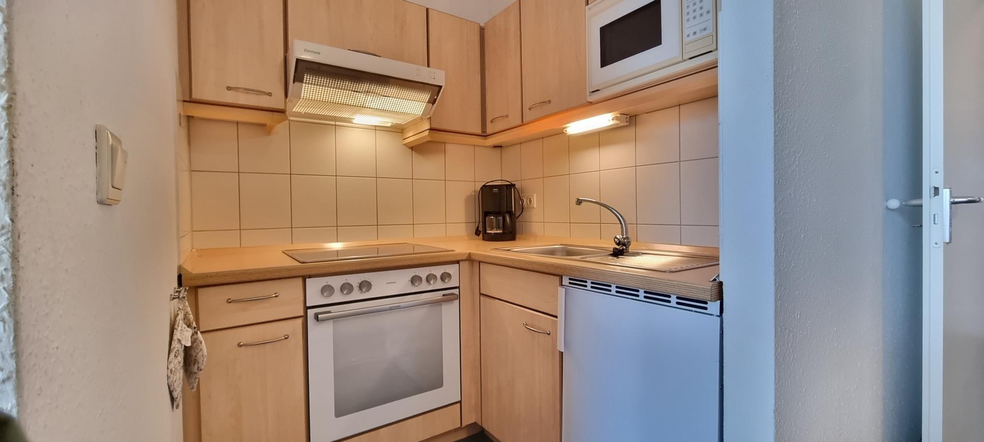 Die kleine, funktionale Küchenzeile ermöglicht eine unkomplizierte Selbstverpflegung im Urlaub. Das Appartement ist gepflegt und standardmäßig ausgestattet – ideal für Gäste, die Wert auf eine einfache, praktische Unterkunft legen.