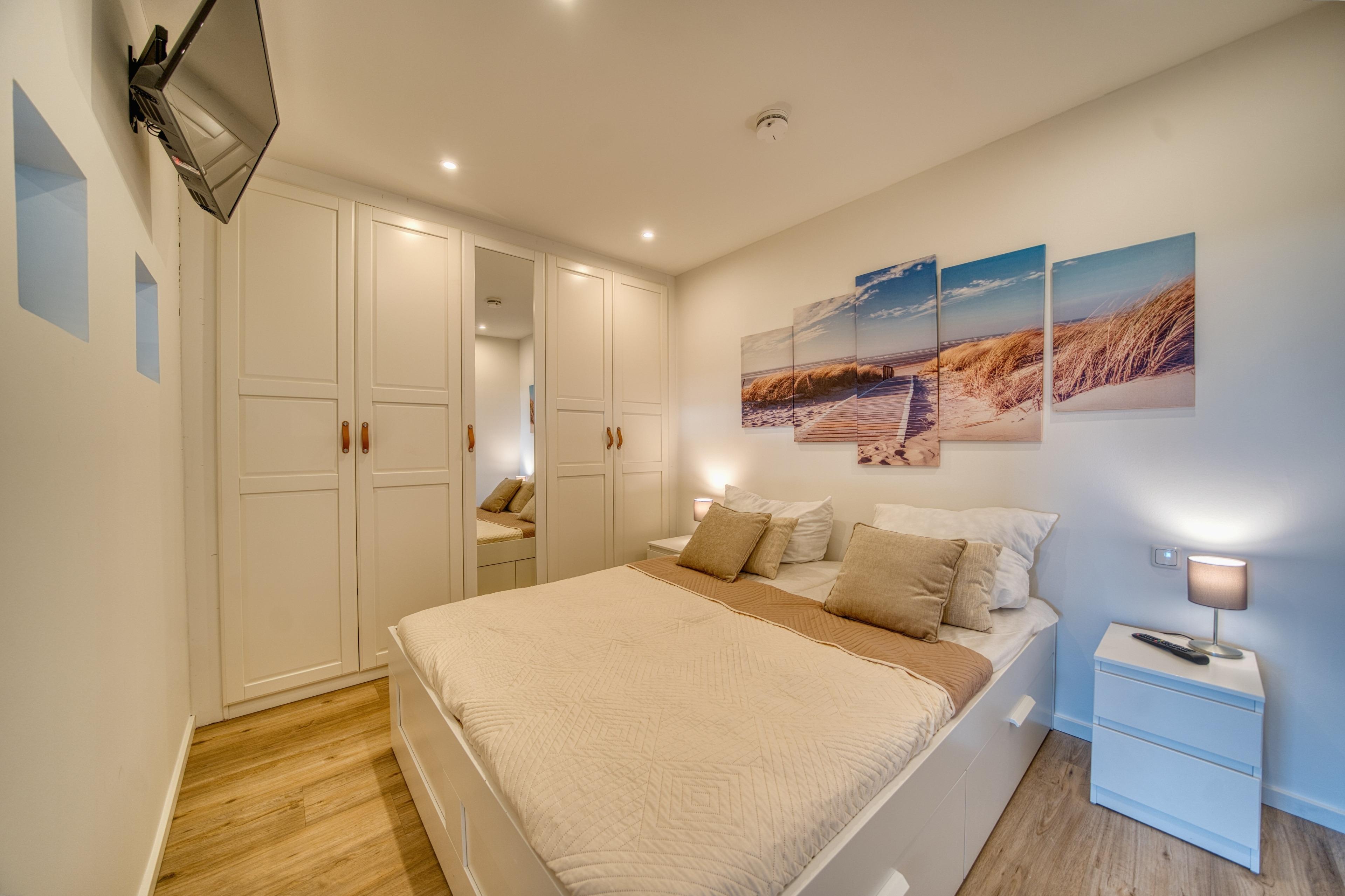 Offener Wohnbereich mit Sofa, Essplatz für 5 Personen und Flachbild-TV. Elternschlafbereich mit Doppelbett (1,60x2,00?m) und eigenem TV, Kinderzimmer mit Doppelbett für 2 Personen. Moderne Laminatböden. Küche mit Ceranfeld, Backofen, Geschirrspüler, Mikrowelle, Kühlschrank mit Gefrierfach, Kaffeemaschine, Wasserkocher und allen Küchenutensilien. Bad mit Dusche und WC. Bonus: WLAN, Freikarte für die Kinderspielwelt „Schatzinsel“. Nichtraucherwohnung, keine Haustiere, Fahrstuhl, Fahrradräume, ca. 300?m zum Strand, kostenloser Parkplatz.