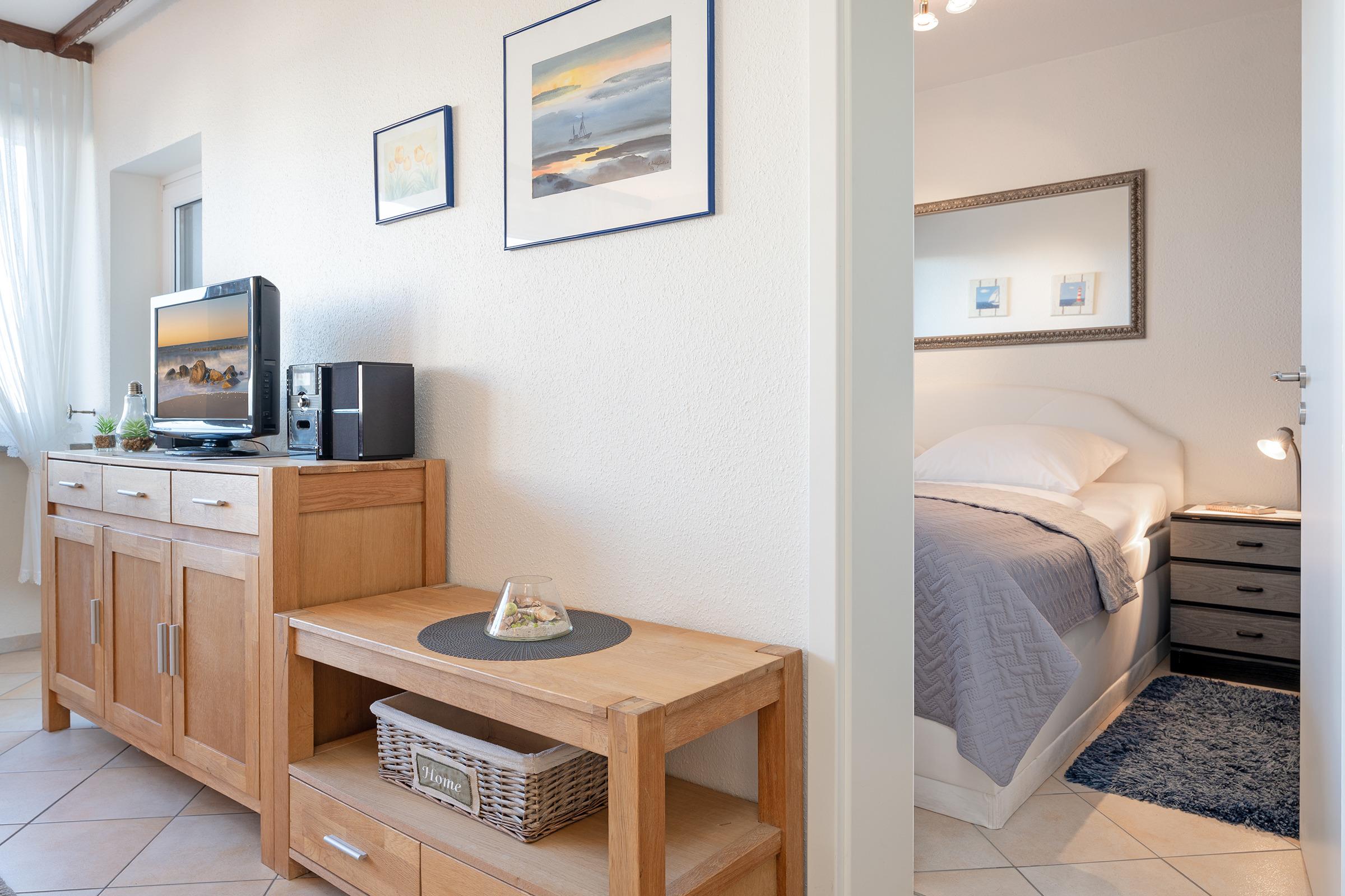 Die angrenzende Küche ist vollständig ausgestattet und lässt keine Wünsche offen: Ein Cerankochfeld, ein Backofen, eine Spülmaschine sowie eine Kaffeemaschine, ein Wasserkocher und ein Toaster stehen für die Zubereitung Ihrer Mahlzeiten bereit. Ein komfortables Schlafzimmer mit gemütlichem Doppelbett sorgt für erholsame Nächte. Das zweite Schlafzimmer verfügt über ein Etagenbett. Das moderne Badezimmer ist mit einer Dusche mit Wanne, Waschbecken, WC und Haartrockner ausgestattet. Eine gemeinschaftliche Waschmaschine und ein Trockner stehen gegen Gebühr zur Verfügung.