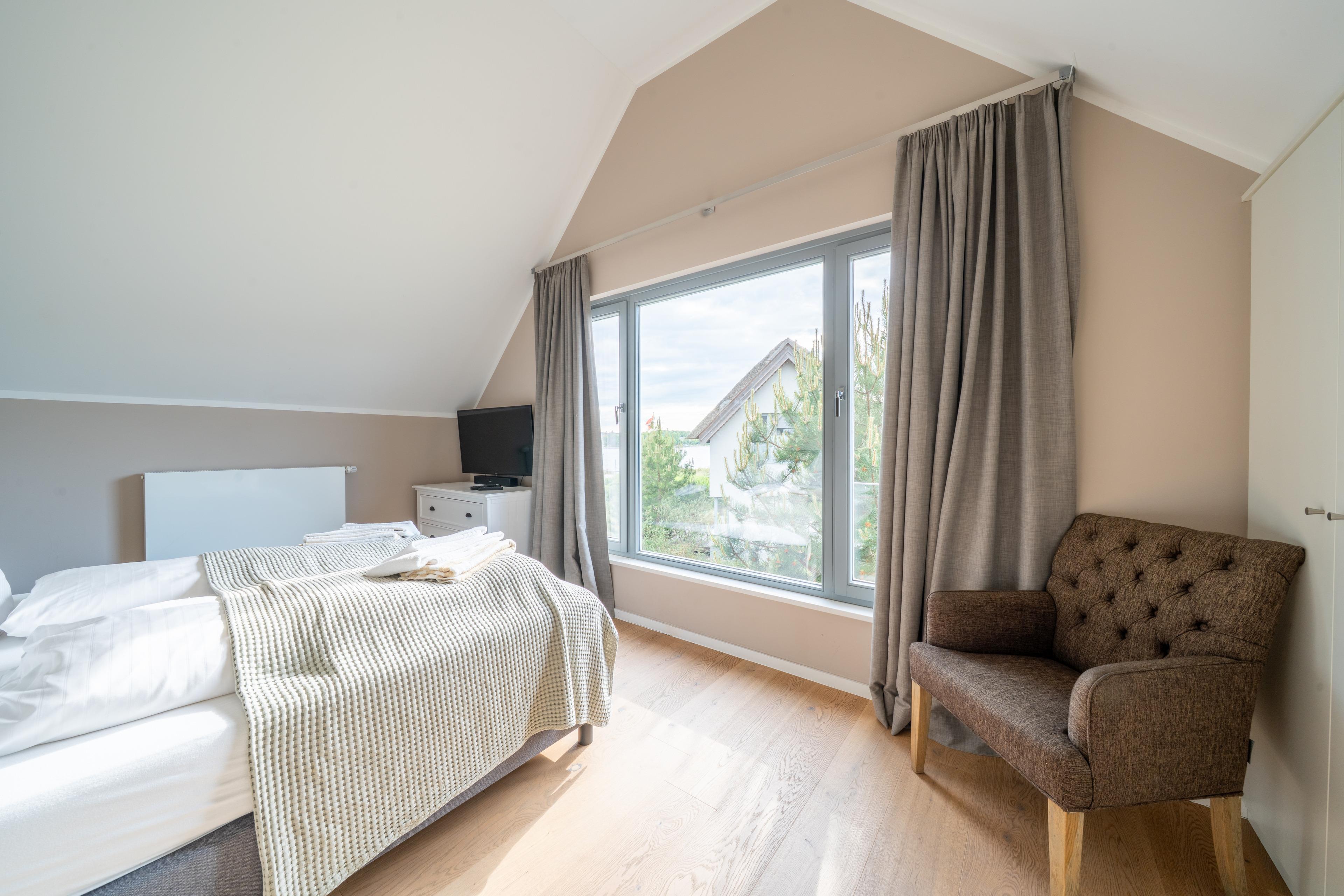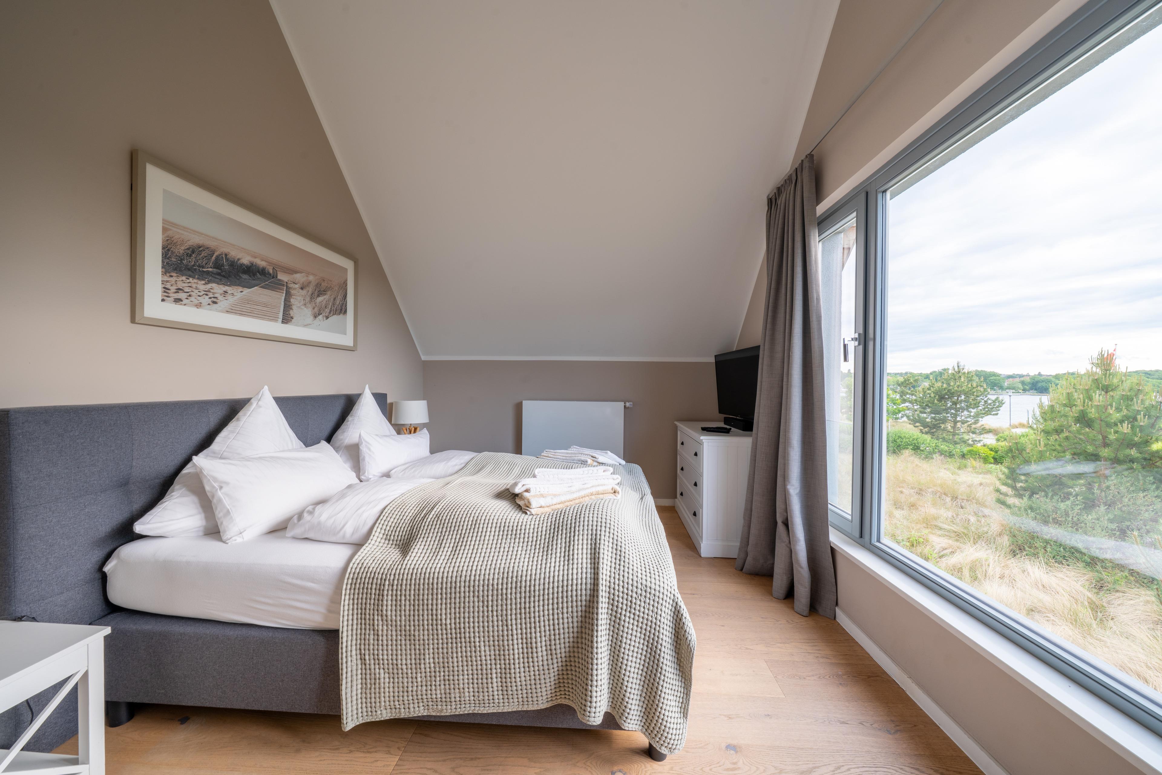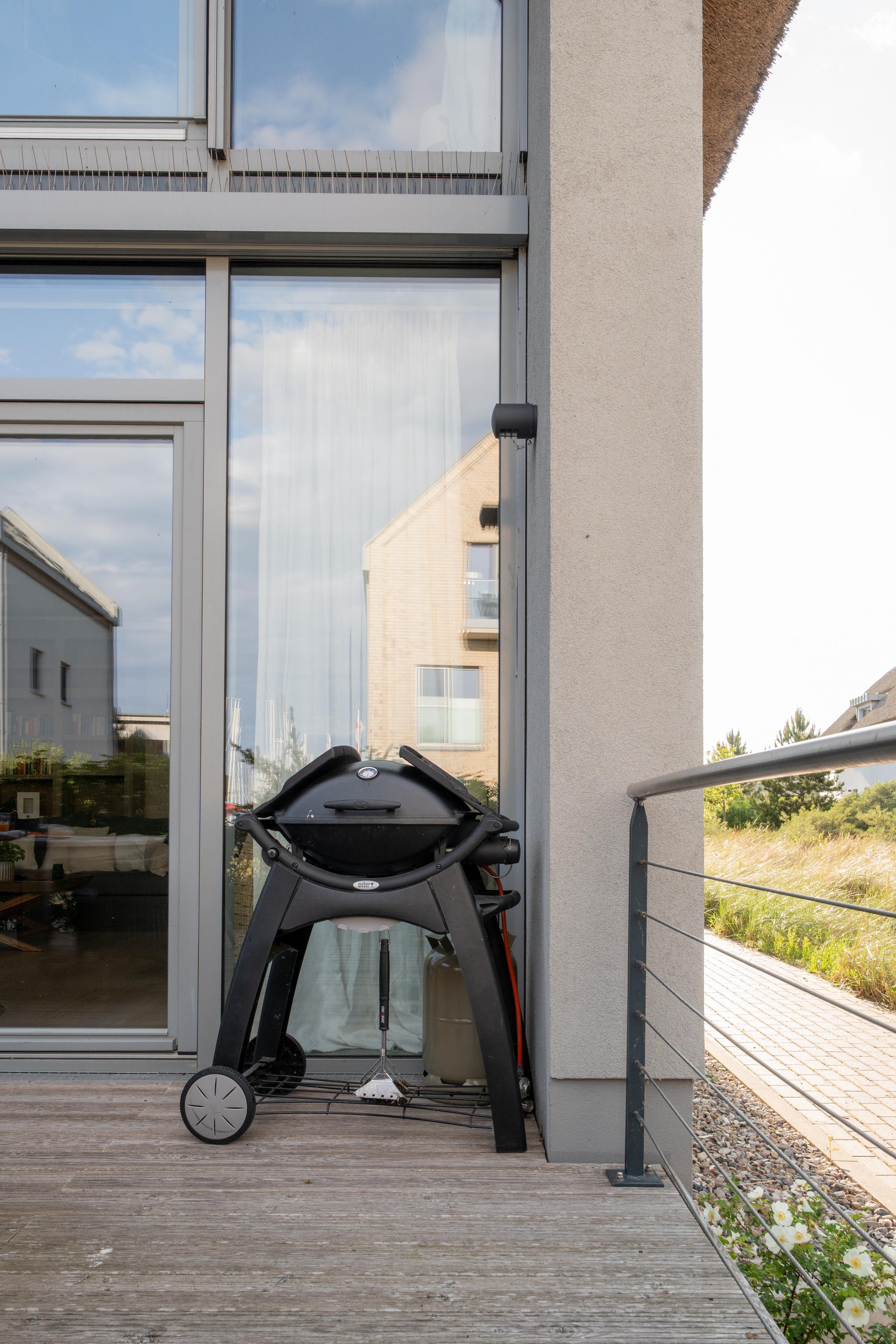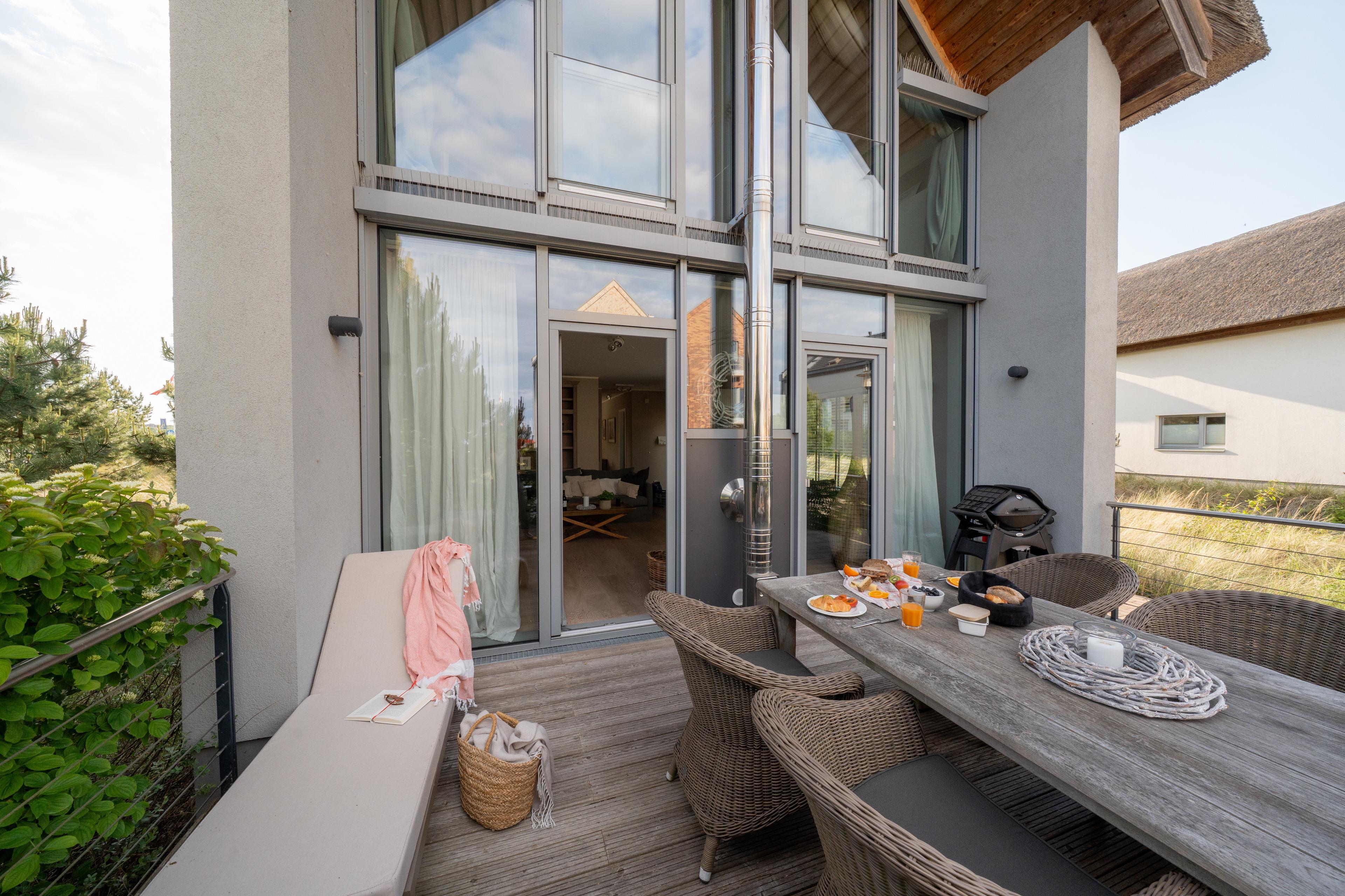 Das freistehende Reetdachhaus Newport steht im 5 Sterne Resort auf dem Graswarder umgeben von einer Dünenlandschaft.