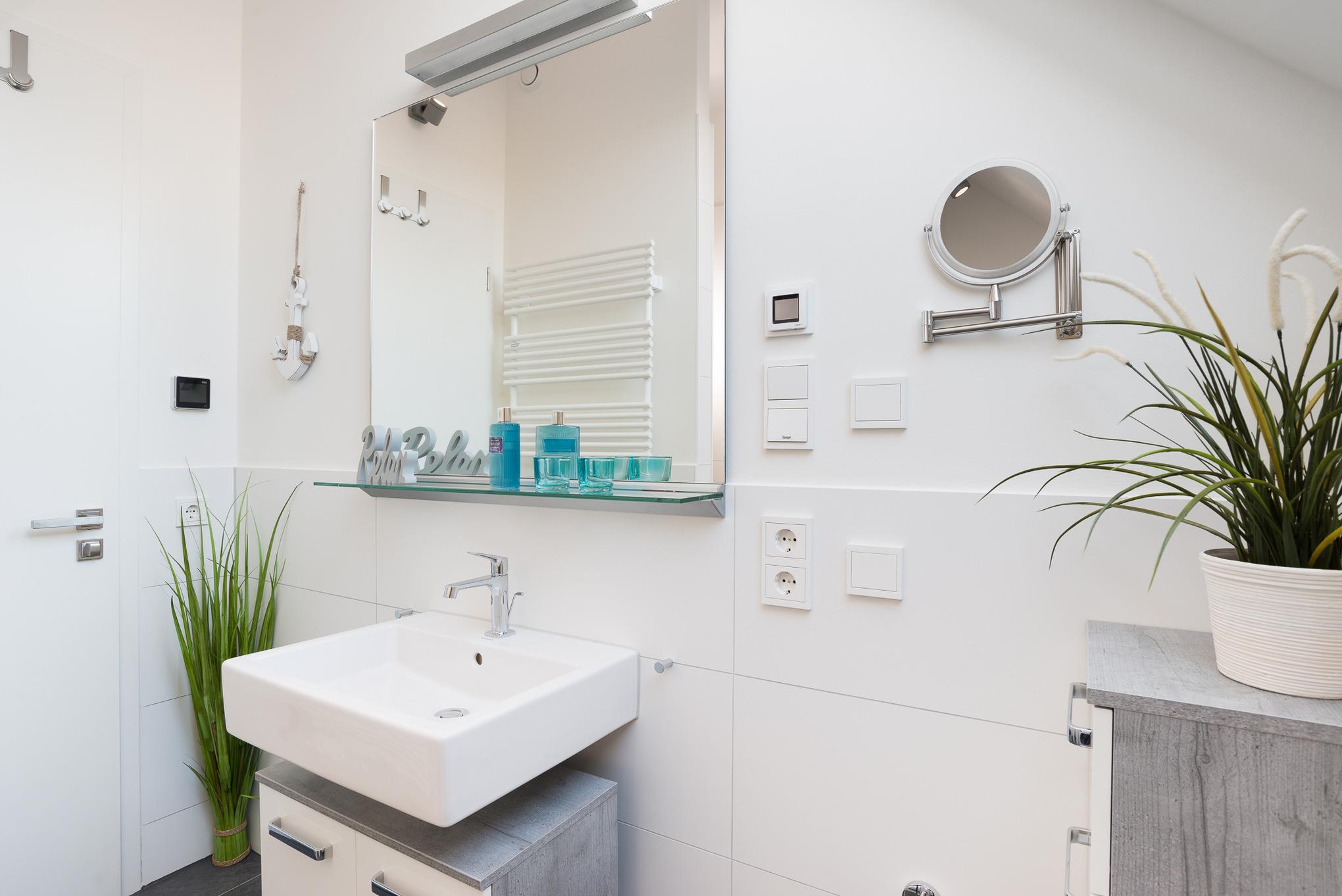Das Duschbad ist mit einer Fußbodenheizung, einem Handtuchwärmer, begehbarer Dusche mit Regenbrause und einem kombiniertem Wasch-Trockner versehen.