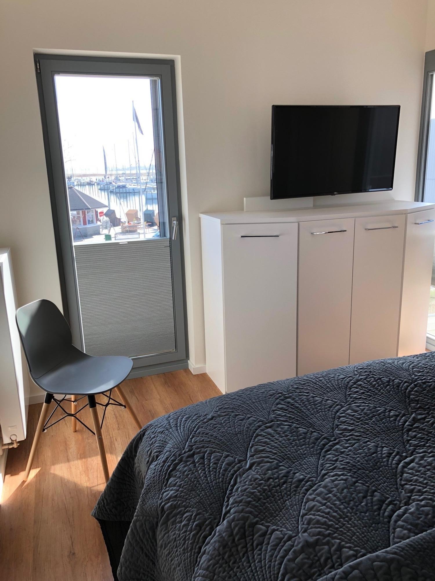Moderne Ferienwohnung in Heiligenhafen mit Sauna, Fitnessraum und Blick auf Yachthafen und Ostsee.