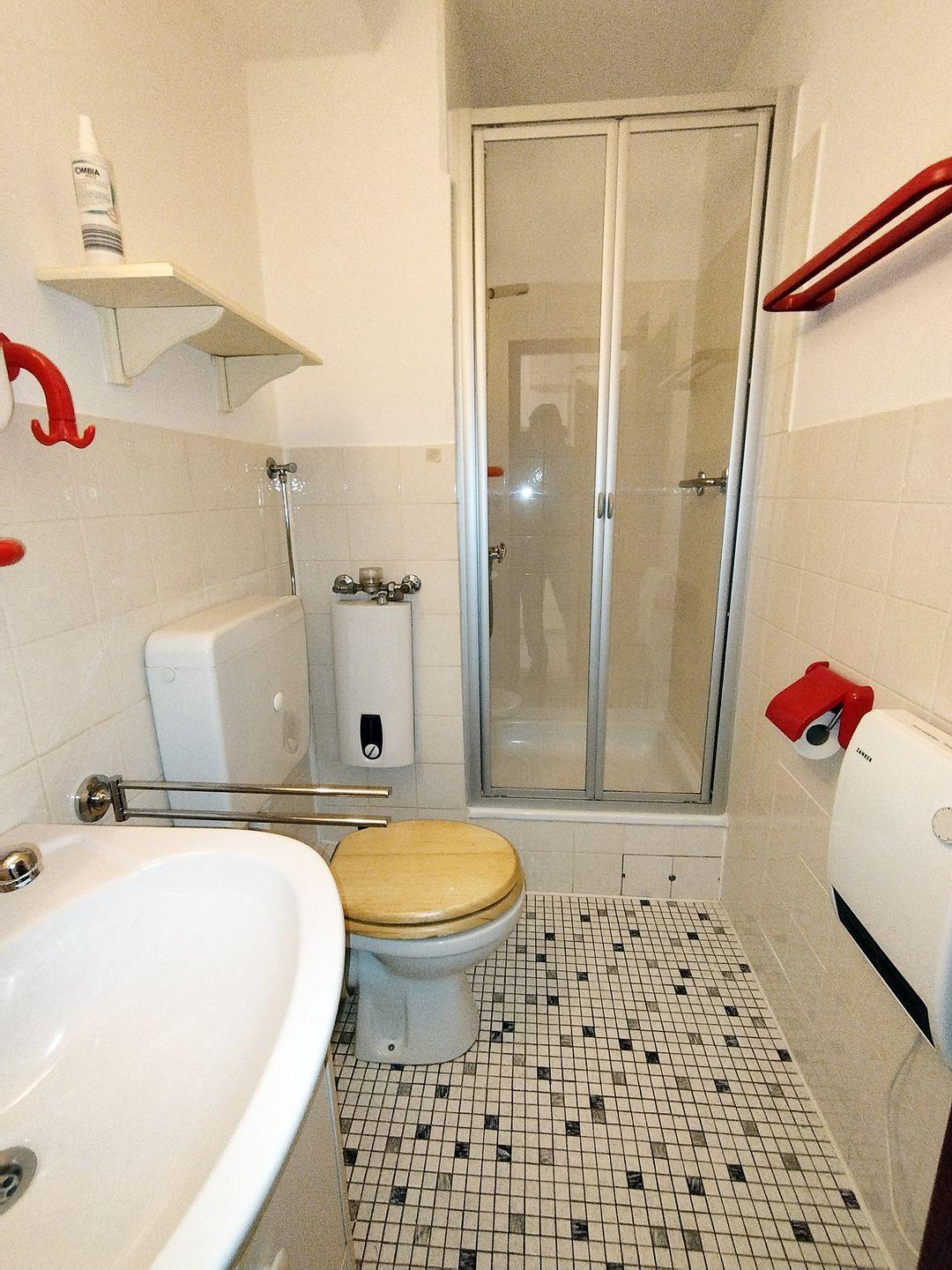 Das Bad verfügt über eine Dusche mit Wanne und WC.