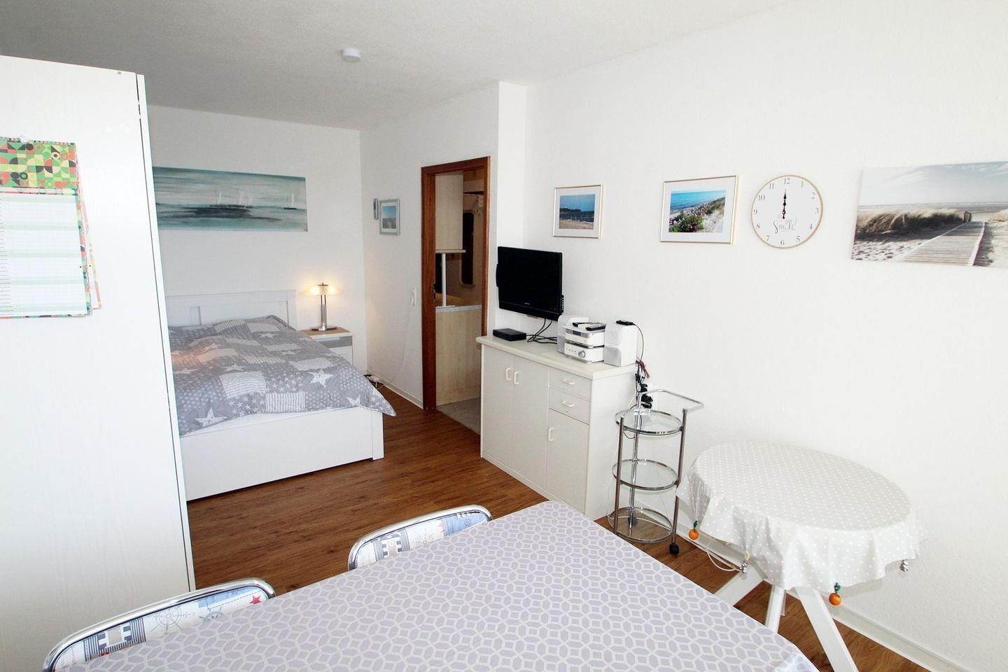 Offener Wohn- / Schlaf- / Essraum mit Doppelbett, Couch und schwenkarem LED-Fernseher. Der Esstisch steht direkt am Fenster zur Südseite und bietet einen schönen Blick über den See.