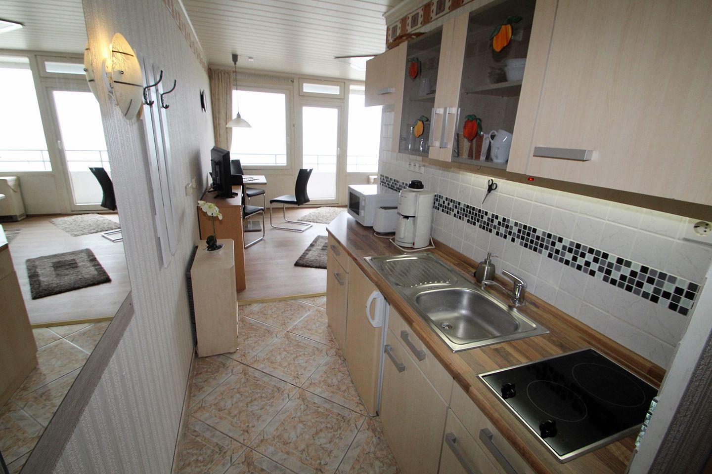 Die Küchenzeile ist mit den üblichen Utensilien ausgestattet. Kühlschrank, Mikrowelle, kleines Cerankochfeld, Kaffemaschiene etc.