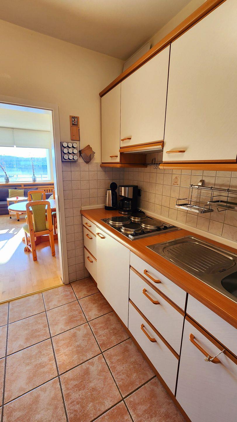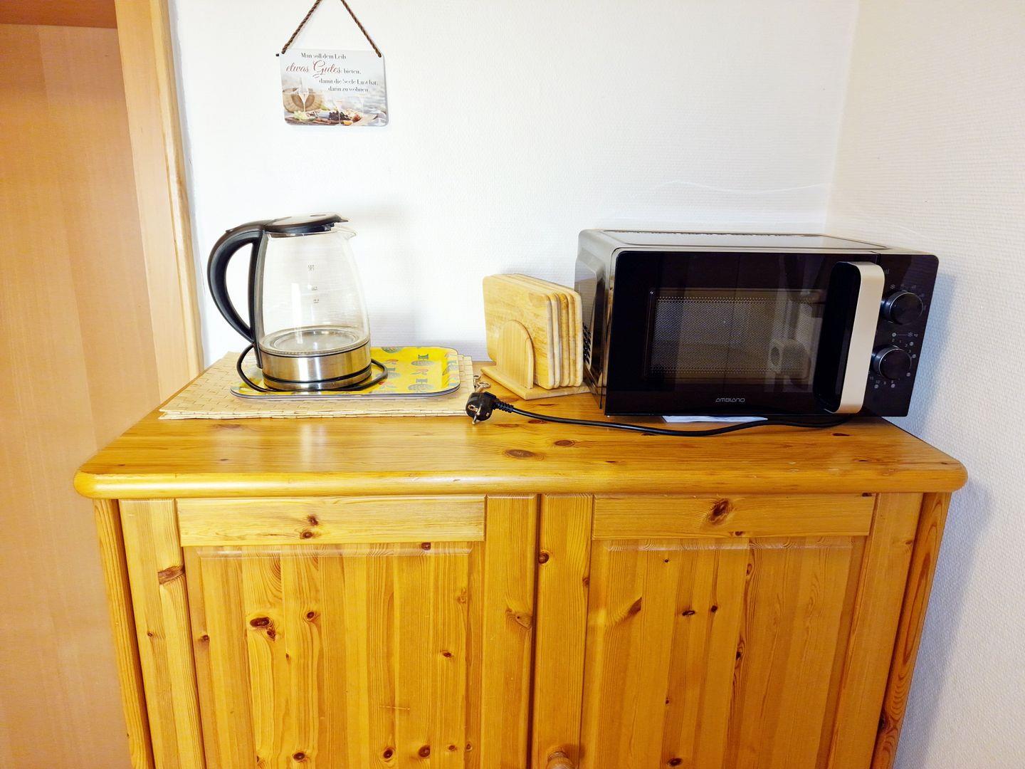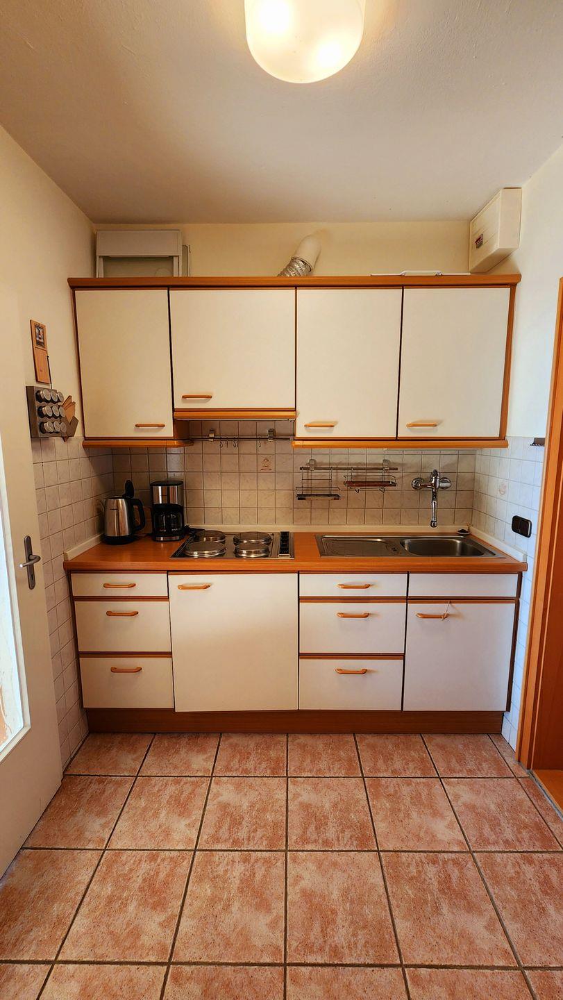 Der offene Küchenbereich ist für 4 Personen voll ausgestattet. Eine Kaffeemaschine, Wasserkocher, Toaster, Geschirr und Besteck sind ausreichend vorhanden.