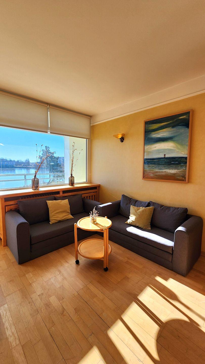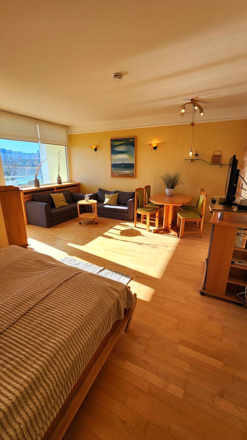 Moderne Ferienwohnung im Strandhotel in Heiligenhafen mit direktem Strandzugang und Blick auf den Binnensee.