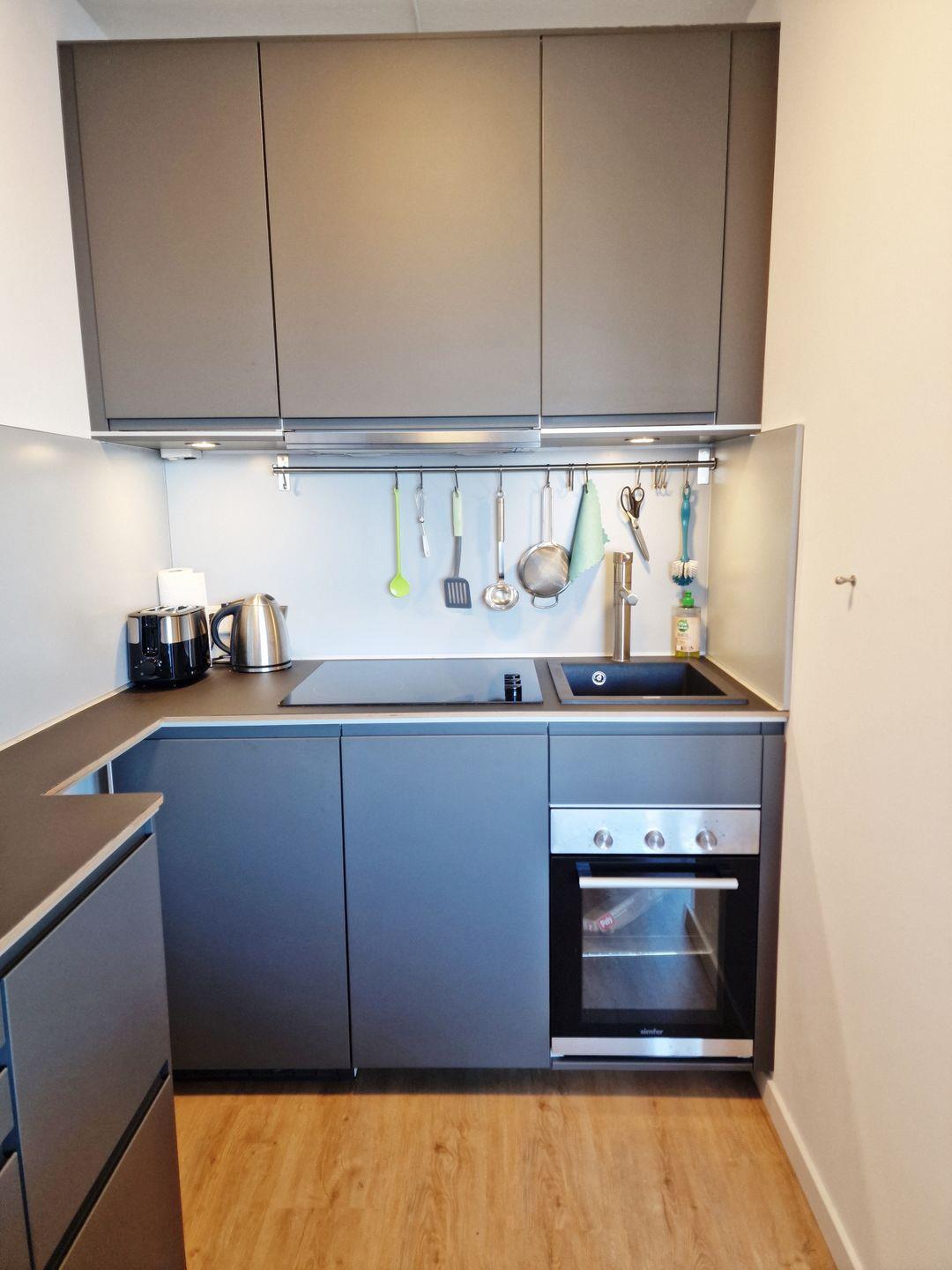Moderne Küchenzeile mit 3-Platten-Ceranfeld, Wasserkocher, Toaster, Backofen und Spülmaschine