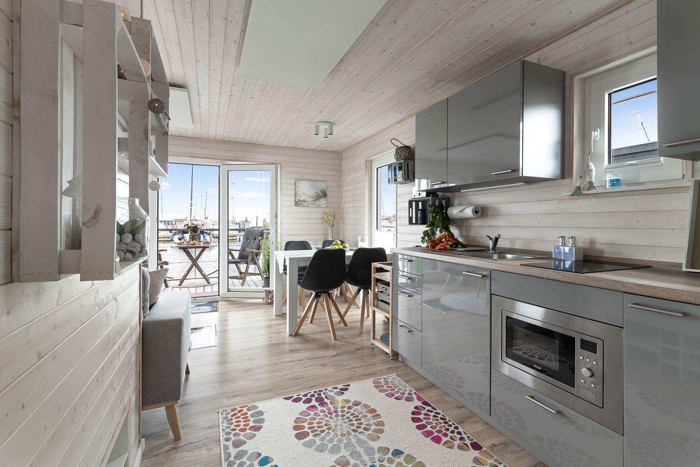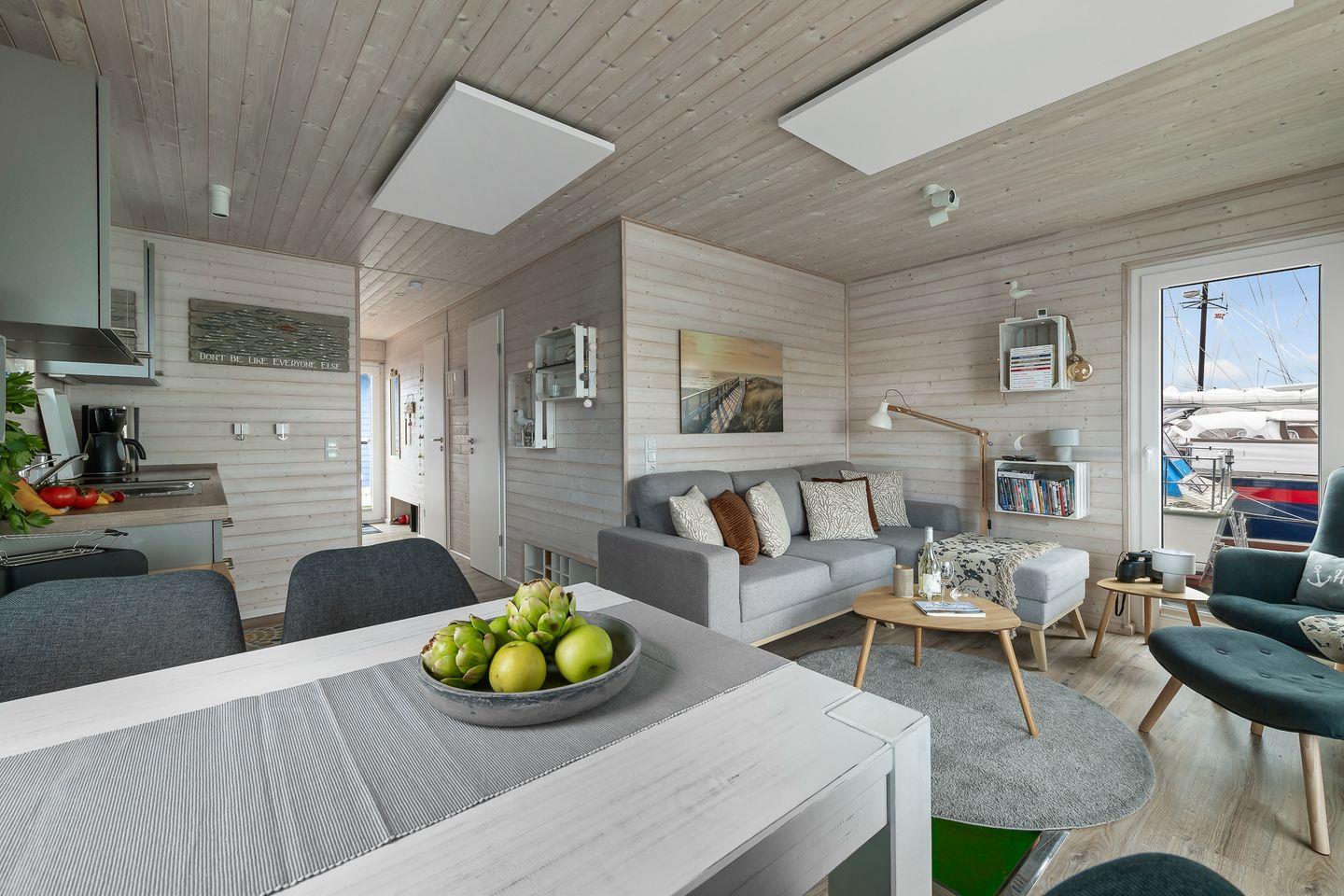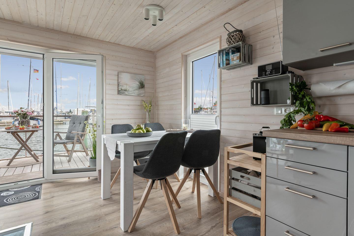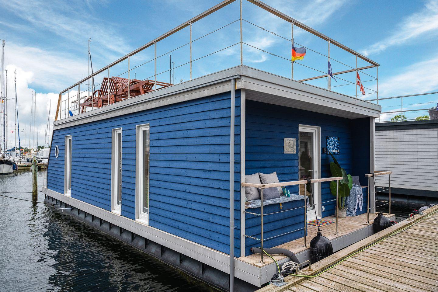 Erleben Sie maritimen Urlaub und entspannen Sie auf dem charmanten Hausboot Blåbær in Heiligenhafen direkt am Wasser.