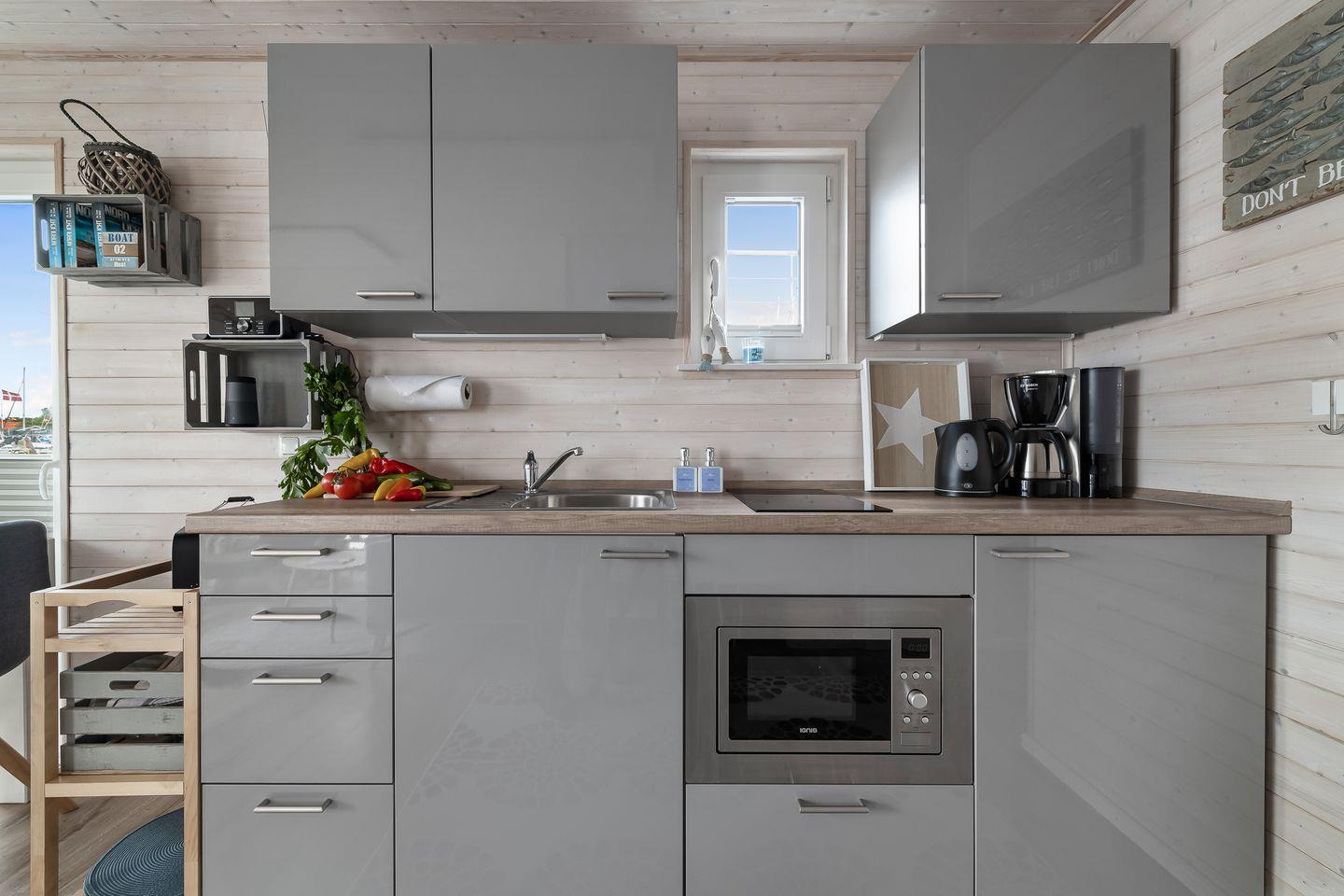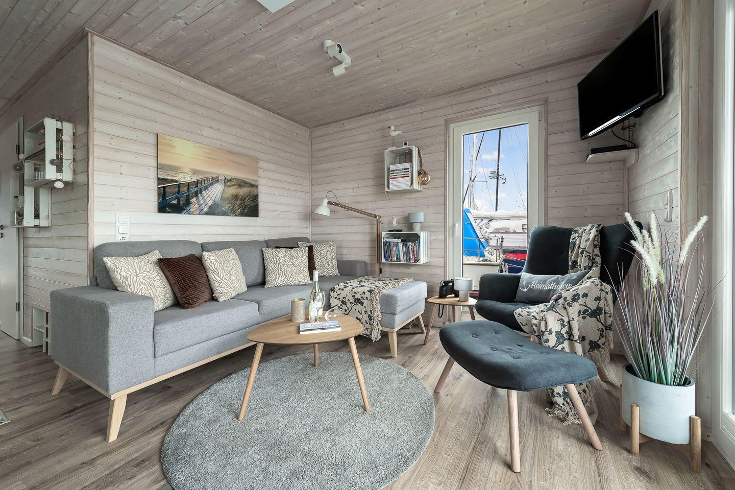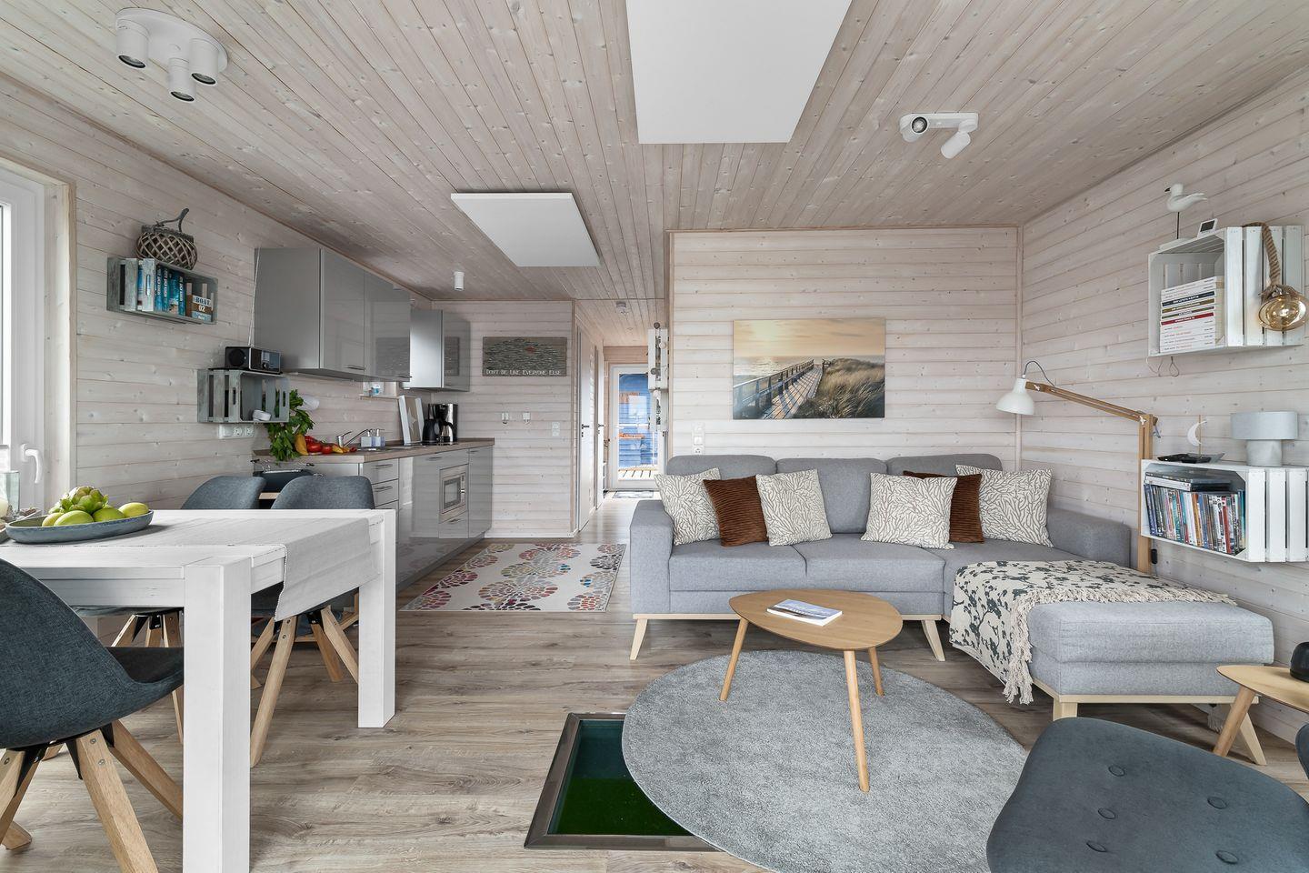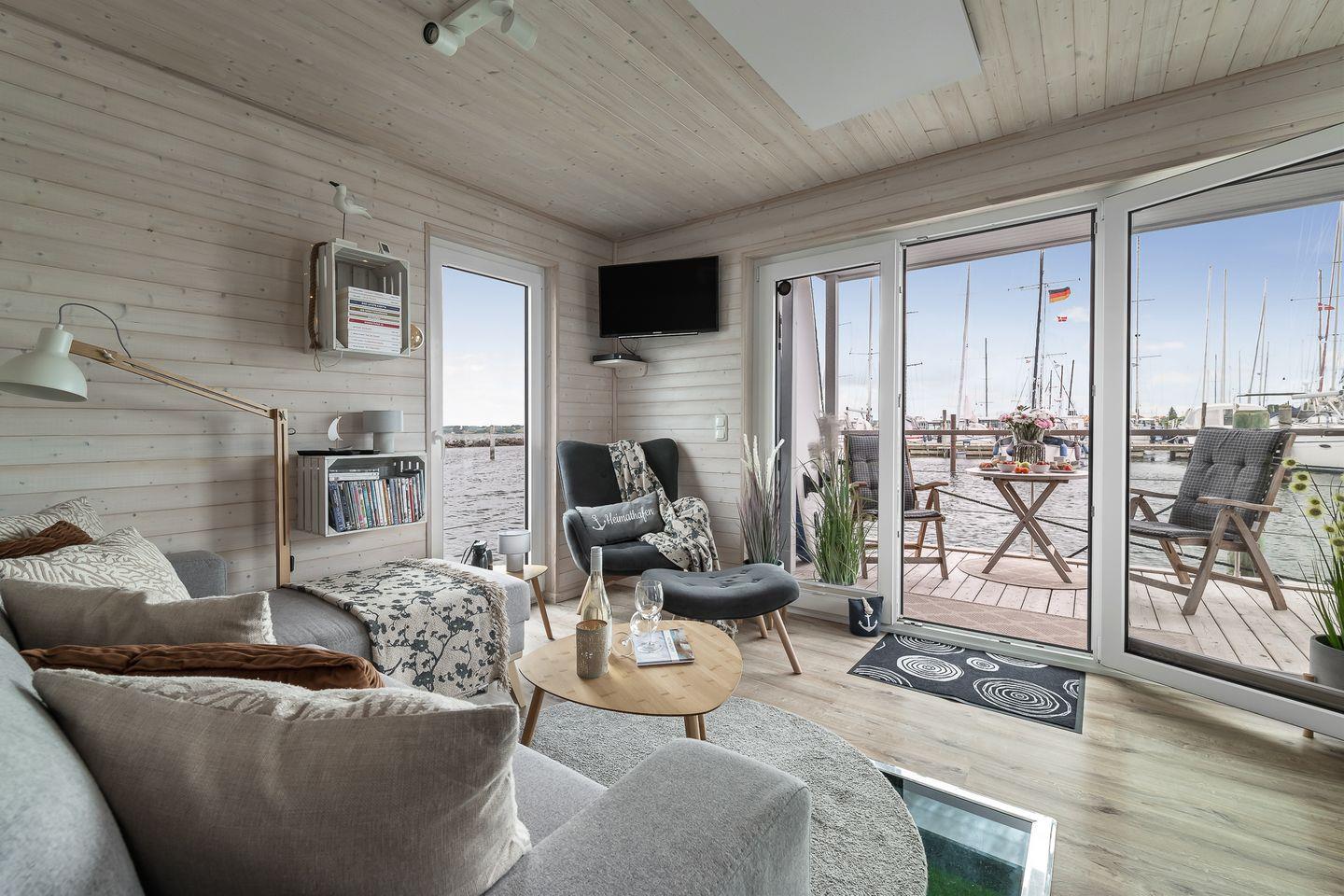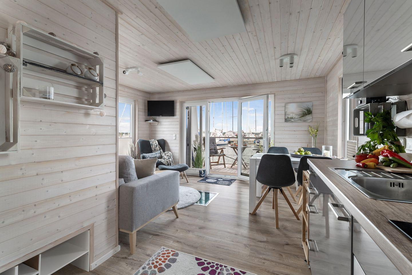 Erleben Sie maritimen Urlaub und entspannen Sie auf dem charmanten Hausboot Blåbær in Heiligenhafen direkt am Wasser.