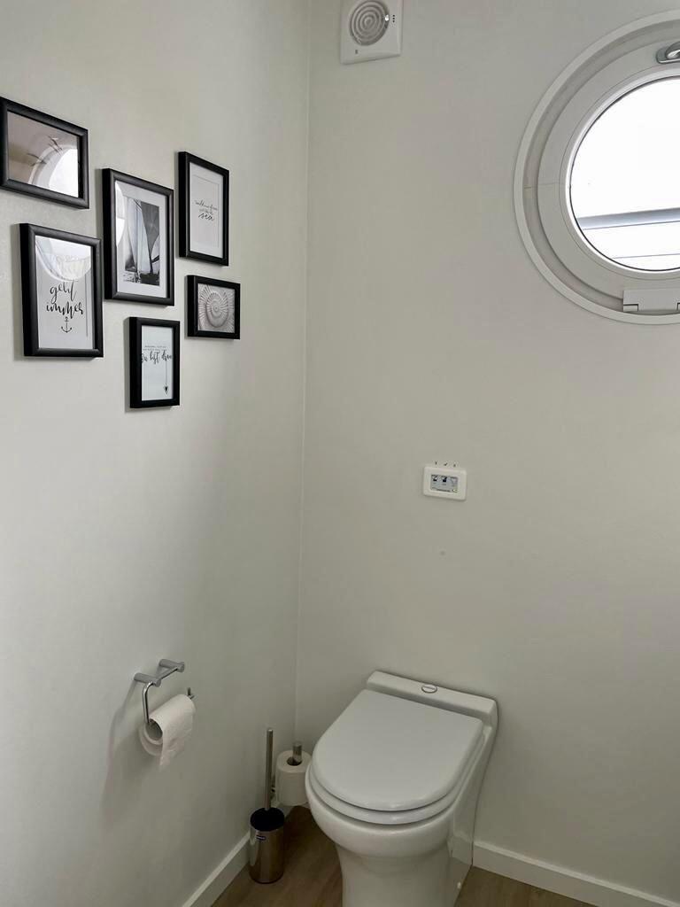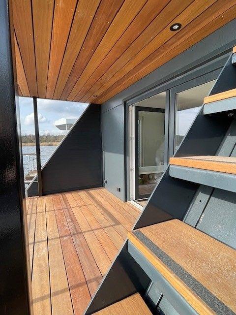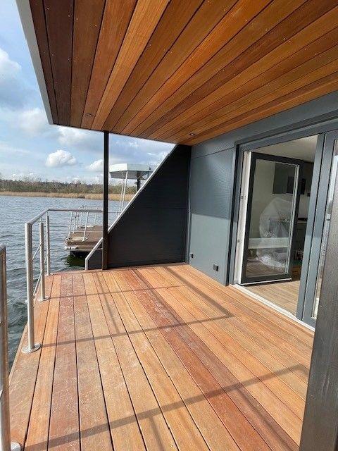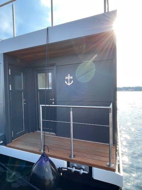 Das fest angelegte Hausboot bietet eine offene Wohnküche, Wohnzimmer/Esszimmer, überdachte Terrasse, 2 Schlafzimmer, Duschbad, separates WC, sowie eine komplett begehbare Dachterrasse.