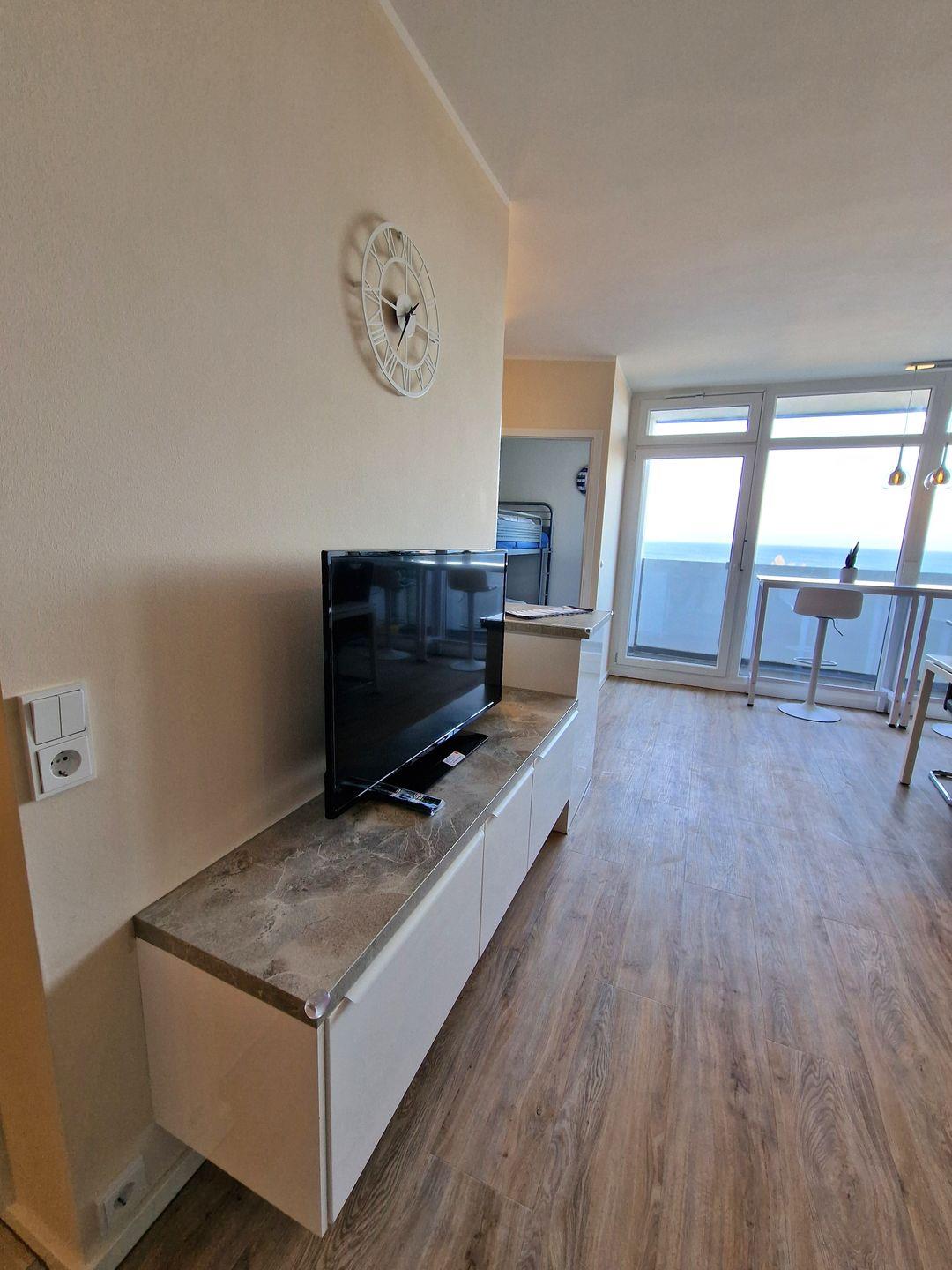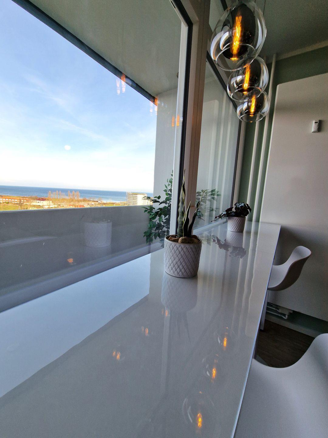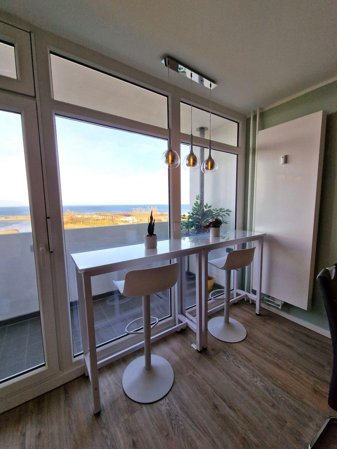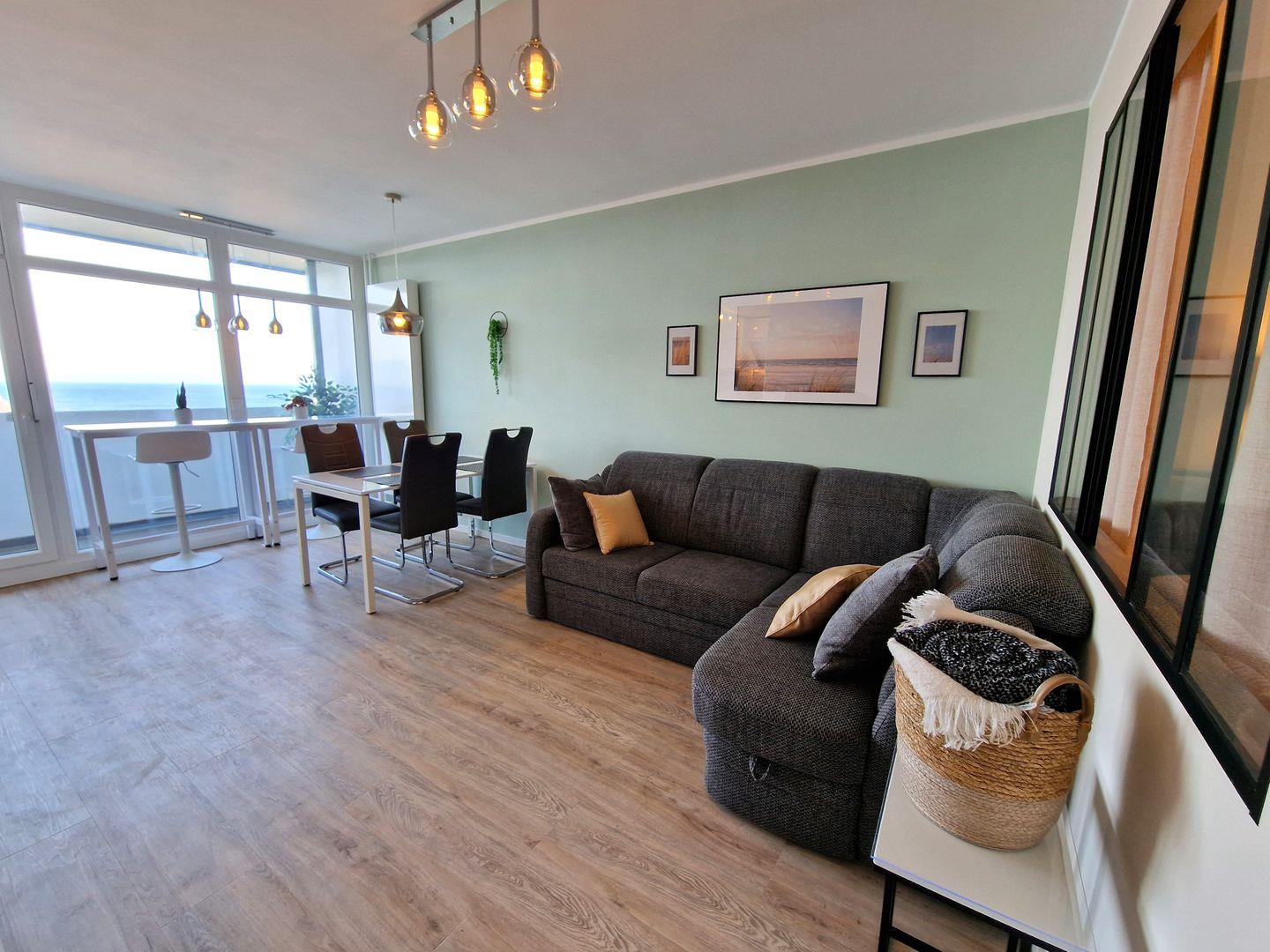 Als Sitzgelegenheiten steht eine gemütliche Couchgarnitur, welche auch als Schlafcouch genutzt werden kann, sowie ein Essbereich und ein kleiner Tresen mit 2 Barhockern, zur Verfügung - von hier aus genießen Sie den direkten und traumhaften Blick auf die Ostsee. Auch ein großer Flachbild-TV (43 Zoll) ist hier vorhanden.
