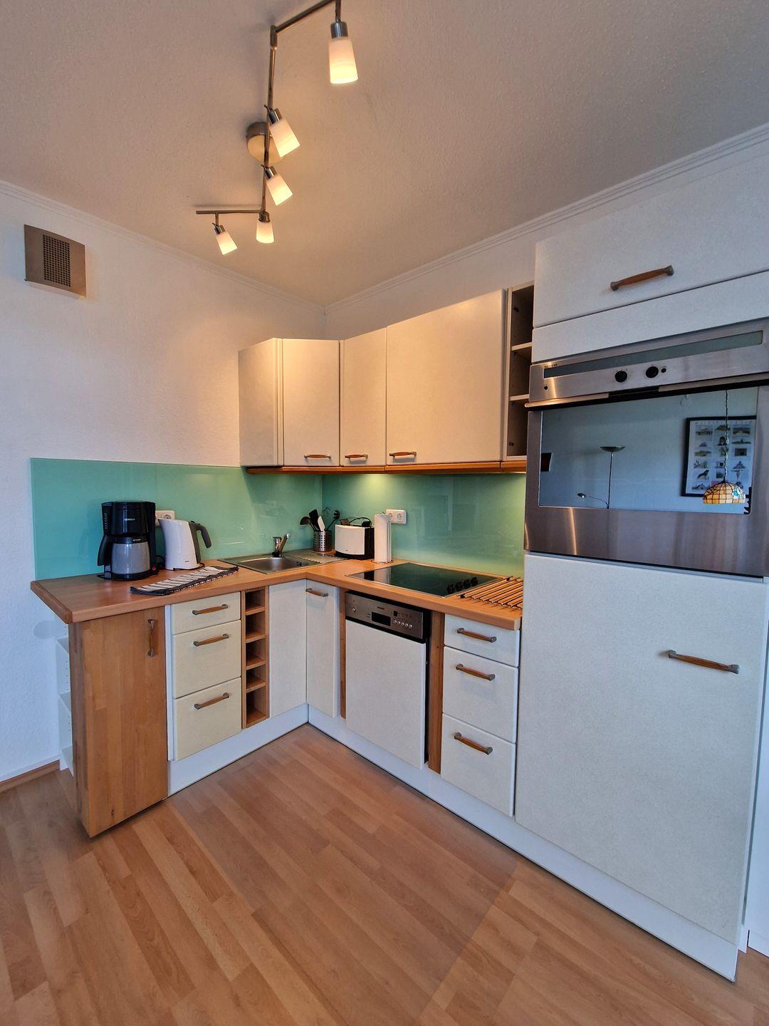 Die offene Küche ist modern gestaltet und bietet Ihnen alles, was Sie für die Zubereitung Ihrer Lieblingsgerichte brauchen, einschließlich Herd, Backofen, Kühlschrank, Geschirrspüler und einer Kaffeemaschine. So können Sie auch während Ihres Aufenthalts kulinarische Highlights erleben.